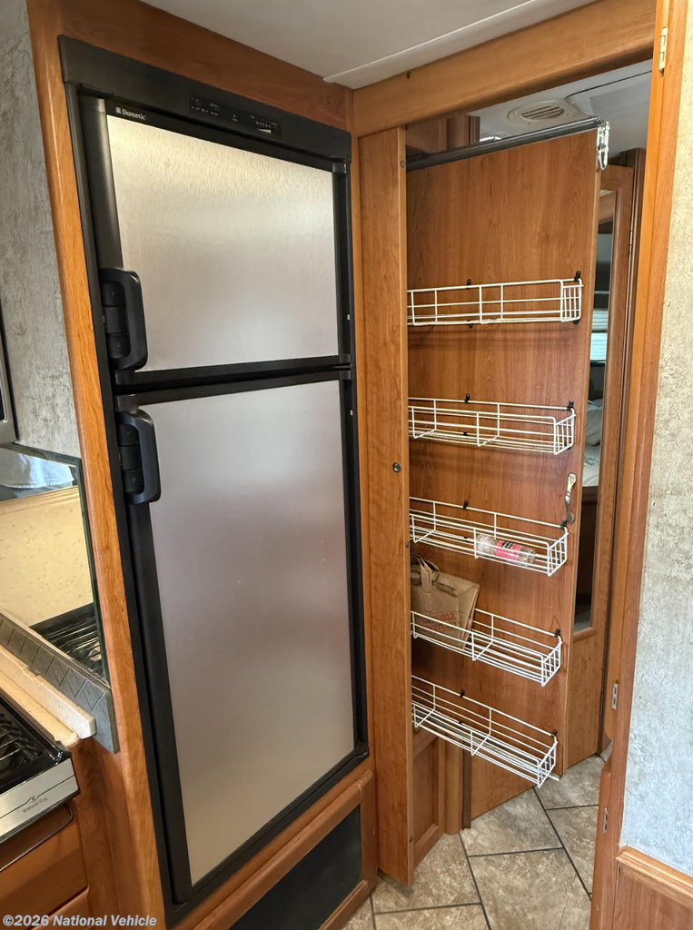 Inside, you?ll find an inviting and well-crafted interior that feels like home. The dual-slide floor plan opens up the living area to create a spacious environment perfect for relaxing or entertaining. Plush seating, solid-surface countertops, rich wood cabinetry, and quality finishes highlight National RV?s attention to detail. The fully equipped kitchen features a refrigerator, three-burner range, oven, and microwave, ensuring you can prepare meals on the road with ease.