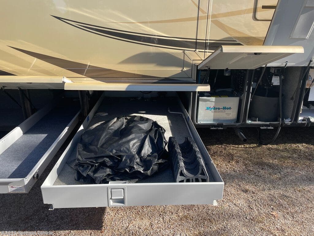 Inside, you?ll find an exceptionally spacious interior anchored by multiple slide-outs that create a wide-open living environment. Elegant finishes like hardwood cabinetry, solid-surface counters, tile flooring, and premium fabrics give the Mountain Aire a truly residential feel. The living area includes plush seating, a large entertainment center, and panoramic windows that invite natural light and scenic views inside.