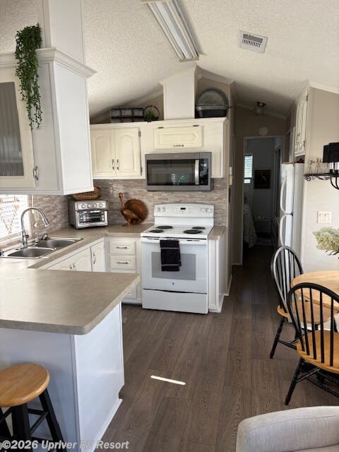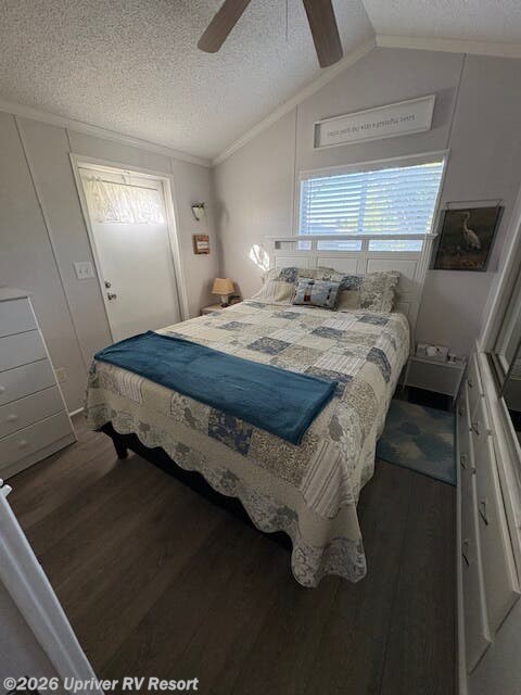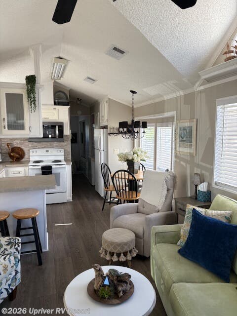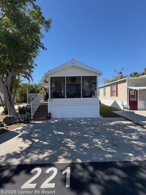 Super cute 2006 Sunlake Park Model close to Tiki bar, and boat launch. 1 Bed, 1 Bath. Everything included except personal belongings and golf cart. Screened Lanai across the front. Privacy screen, wicker furniture and a bar frige. New Hardwood Click flooring. AC put in 5 years ago and regularly maintained twice a year. Appliances that stay are the Refridgerator, Stove, Microwave, and stack washer/dryer. There is spray foam under belly. Hot water heater is original to home. The roof was redone in 2023. There is a 5x8 shed in the back with a freezer. There are new window coverings and a new slider after Hurricane Ian.