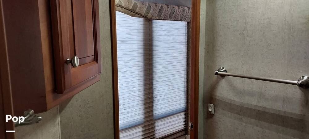 Inside, the coach features elegant lighting throughout, including mood lighting positioned above the crown molding in all slide rooms to create a warm atmosphere.