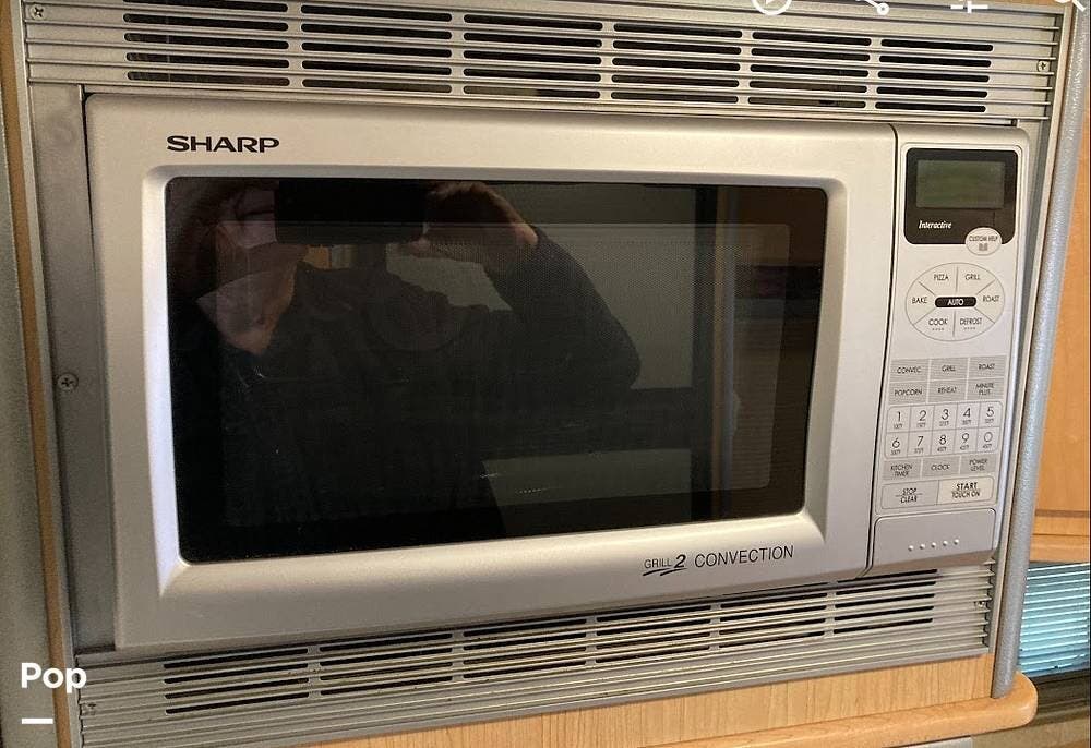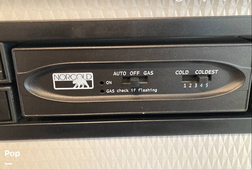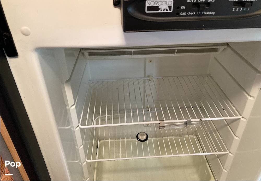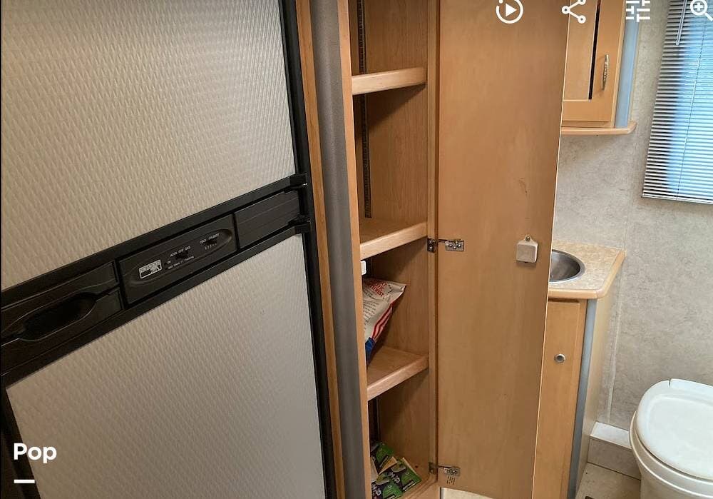 The kitchen provides the essentials: a refrigerator, a two-burner stove, a convection microwave, and plenty of storage space, ensuring you have what you need to cook and store meals on the road.