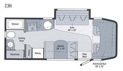 The interior of the 23H is straightforward yet thoughtfully arranged. The layout includes a convertible dinette and an over-cab bunk, comfortably sleeping three to four people.
