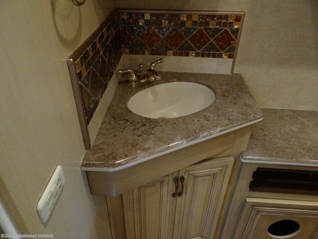 The interior showcases American Coach?s renowned craftsmanship with elegant finishes, rich cabinetry, and a spacious layout enhanced by multiple slide-outs. The living area offers plush seating, including a sofa and premium recliners, along with a well-appointed entertainment center for relaxing evenings on the road. The gourmet kitchen features solid-surface countertops, a residential refrigerator, convection microwave, stovetop, and ample storage, making meal preparation both practical and enjoyable.