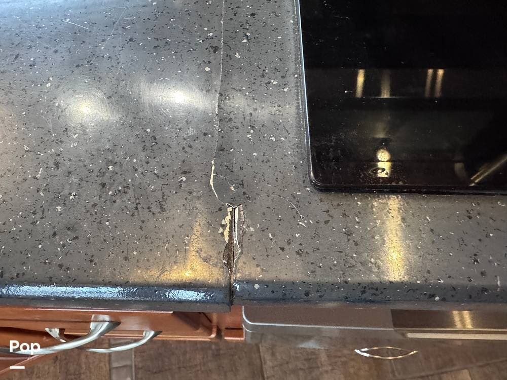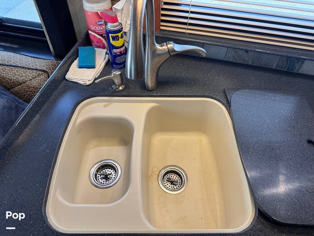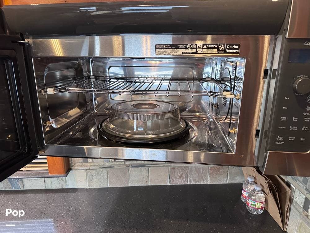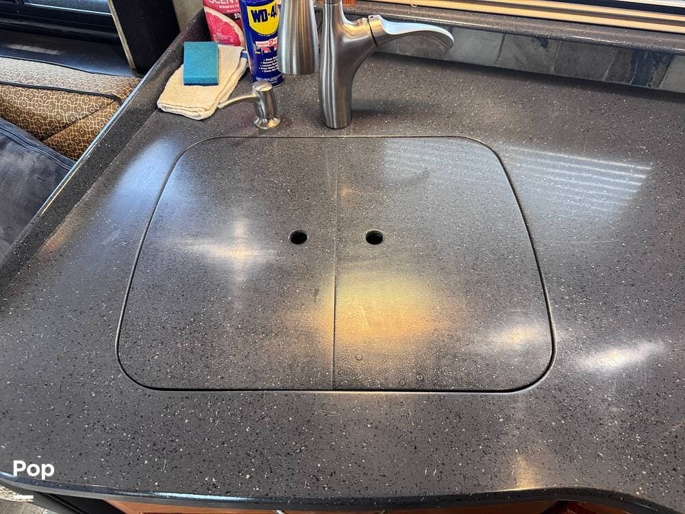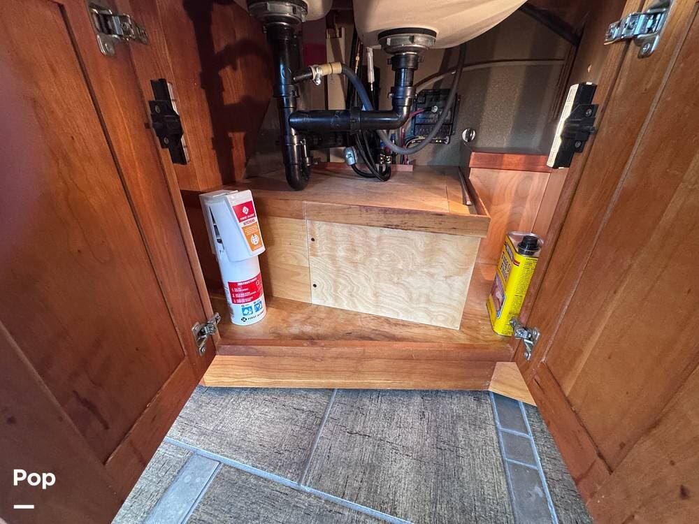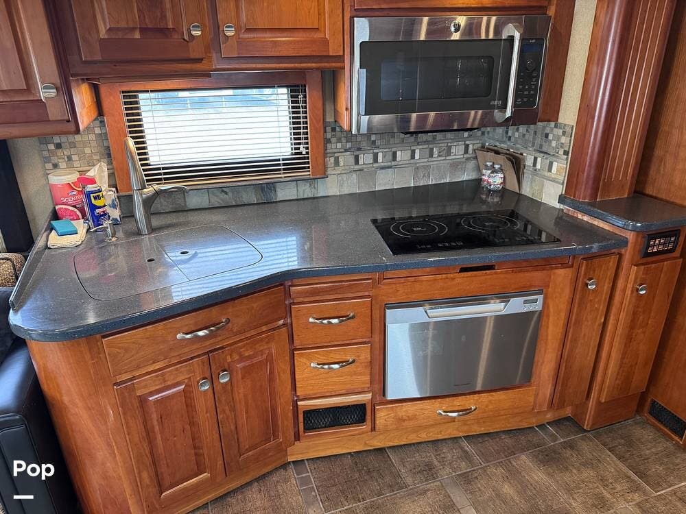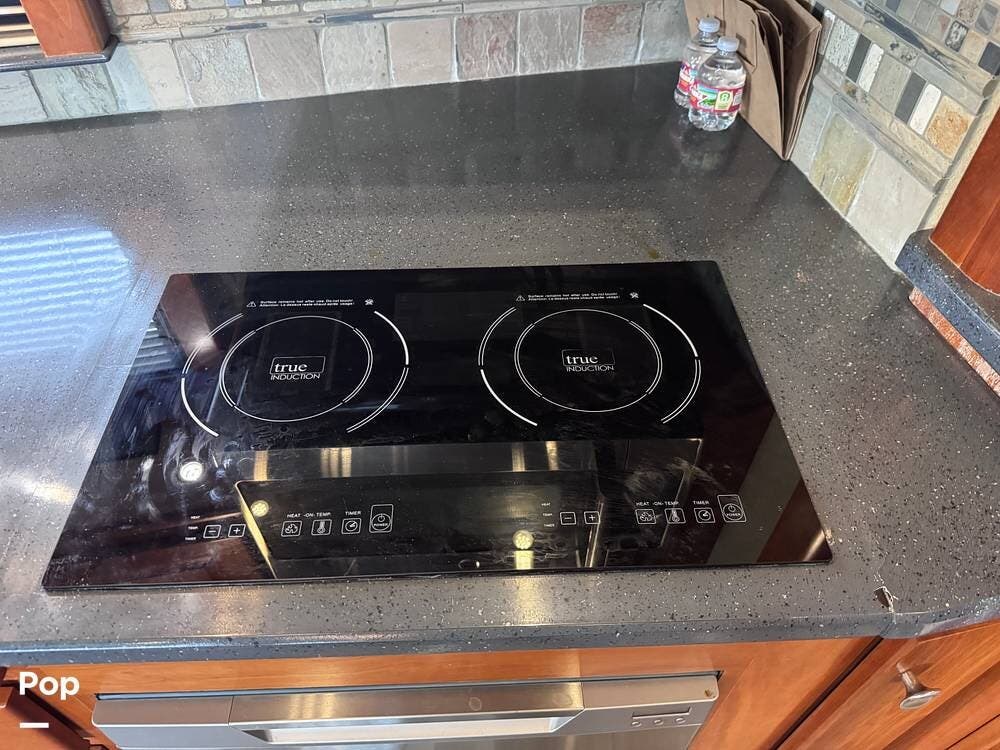The kitchen is designed for extended travel and full-time living, offering abundant cabinetry, ample counter space, and a modern induction cooktop that provides efficient, precise cooking. The well-planned layout supports everything from quick meals to full dinner preparation while on the road.