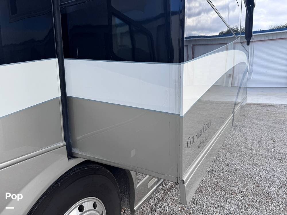 Inside, the living area showcases Country Coach craftsmanship with a spacious, residential-style layout designed for comfort and entertaining. High-quality finishes, generous seating, and large windows create a bright and inviting environment ideal for relaxing or hosting guests.