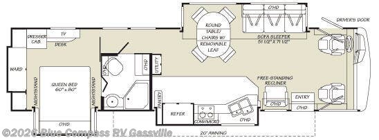 Triple Slide, Rear Wardrobe, Storage Cabinet, TV/Desk, Queen Bed Slide w/Nightstands, Side Isle Bath w/Angle Shower, Lav., Double Bath Entrance, Pantry, Utility Cabinet, Refrig., 2 Burner Cooktop w/Microwave Above, Double Kitchen Sink, Recliner, Sofa Bed, Round Dinette w/Chairs and More.