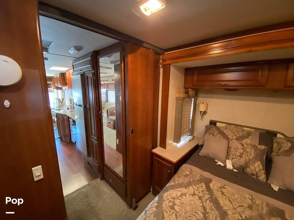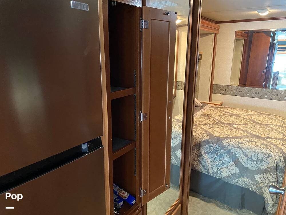When extended, the two slideouts provide a spacious interior living area. The master bedroom features a queen-size bed, ample closet space, and mirrored closet doors that make the room appear even larger.