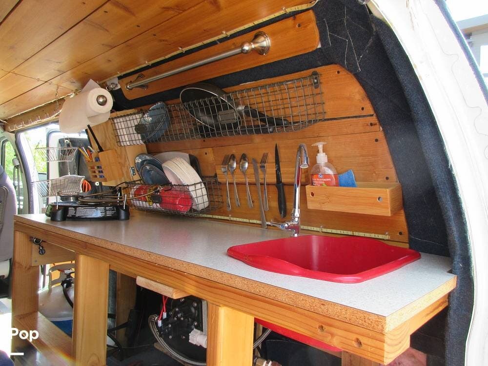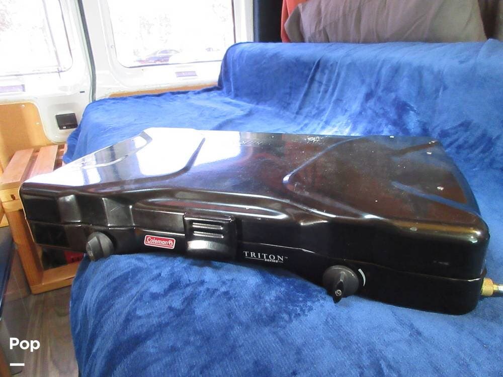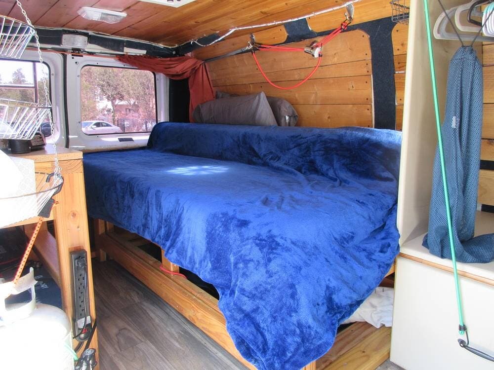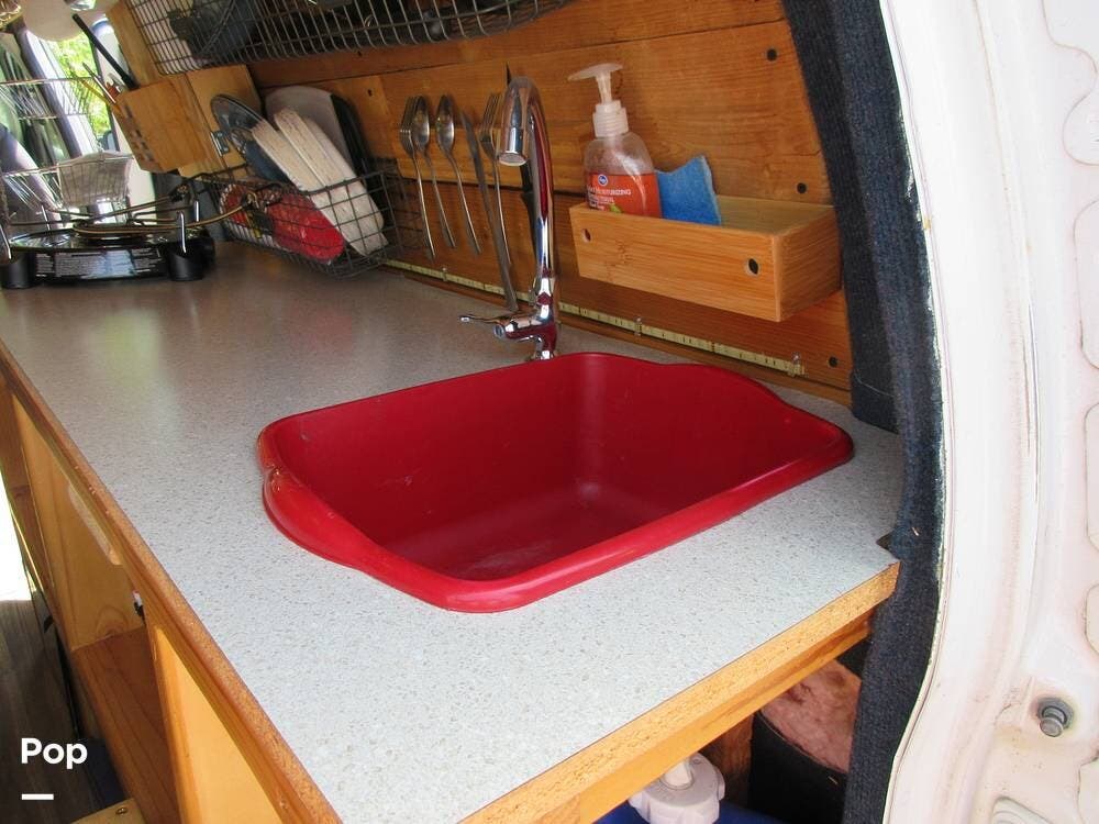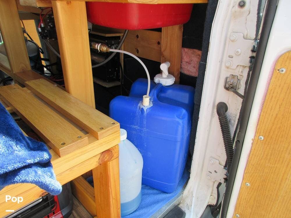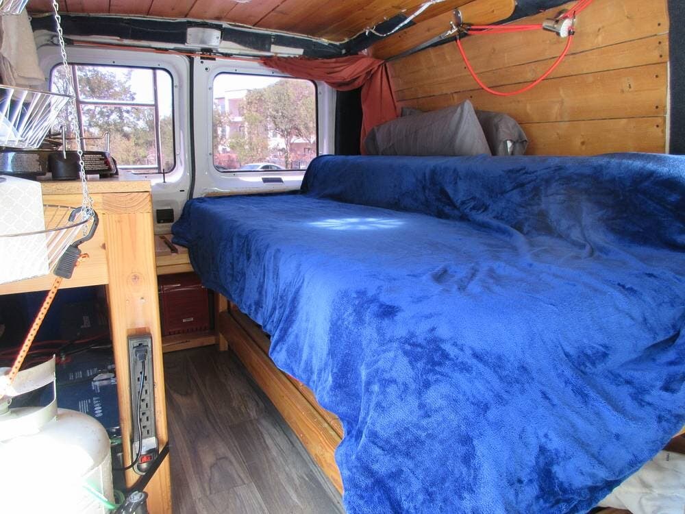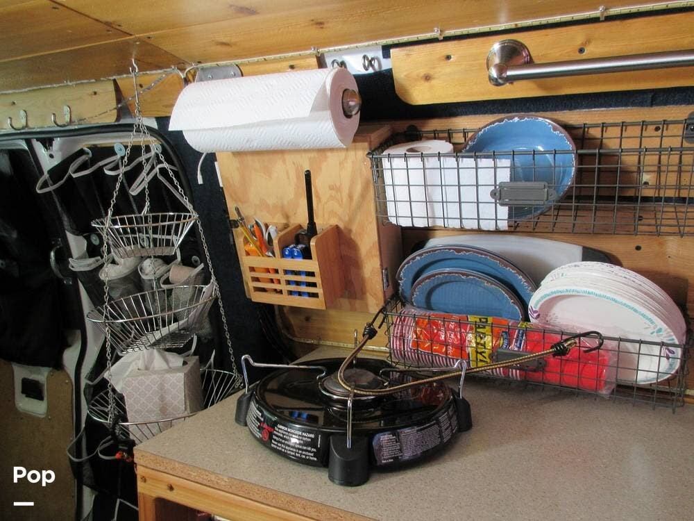 Want to save money on meals while you are on the road? This van can assist with a mini 12V refrigerator and a one-burner propane stove with a propane tank. Plus, clean-up is a breeze with the built-in removable sink. Freshwater is provided via a 6-gallon container using an electric pump.