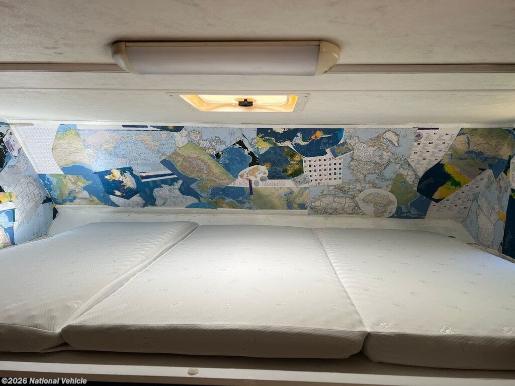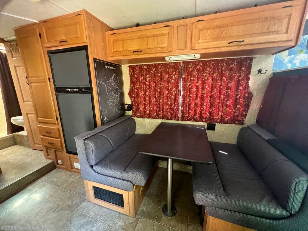 The main living area is warm and inviting, designed to maximize space and functionality while traveling. The booth dinette provides a great spot for meals, relaxing, or additional sleeping space, while thoughtful cabinetry and storage are found throughout.