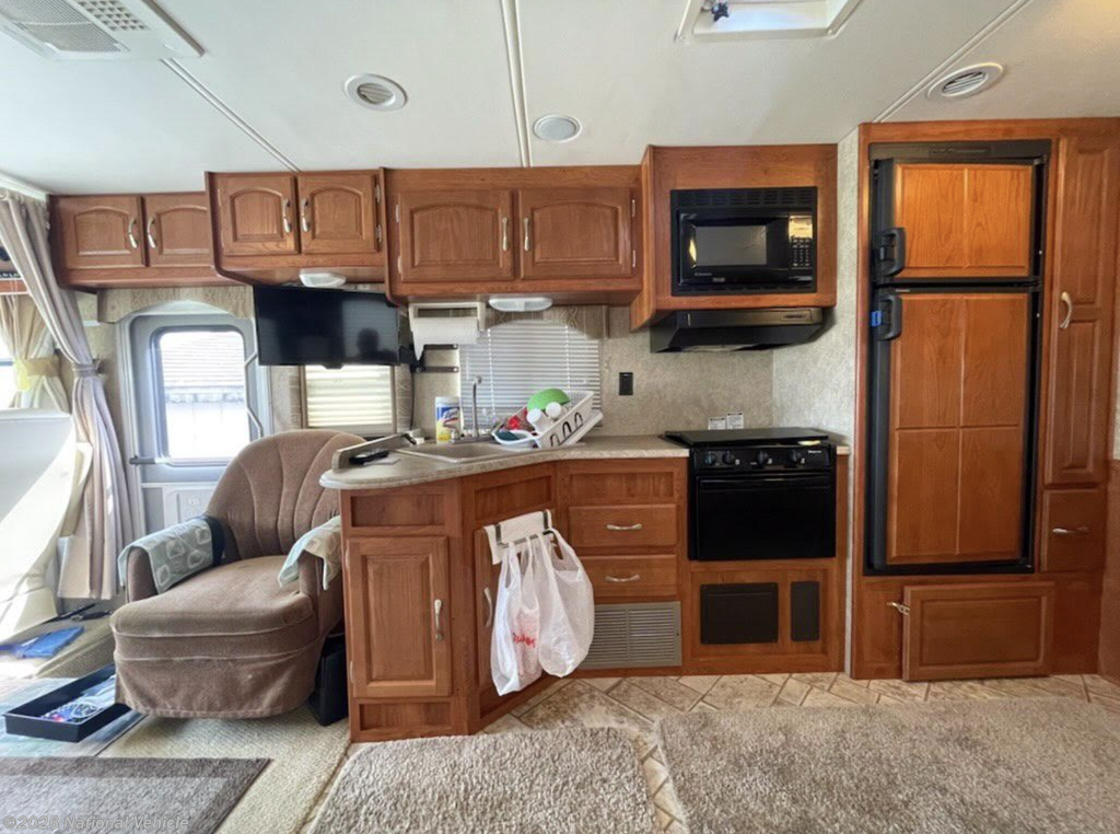 Step inside and take a look back at all of the convenient features that would make any journey enjoyable. The kitchen area features everything you need to prepare great meals on the go including a sink, a three burner range with microwave, oven, and a refrigerator/freezer. There is also plenty of storage for all of your dry and canned goods. Have a seat at the comfortable dinette, where you can enjoy meals with your family.