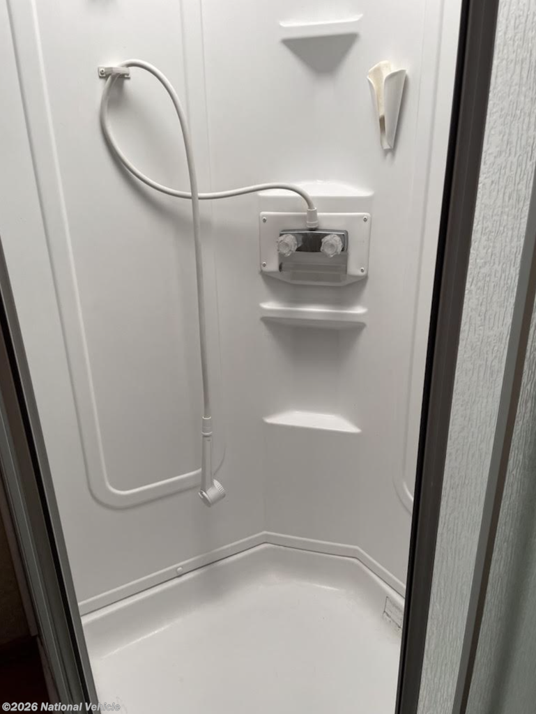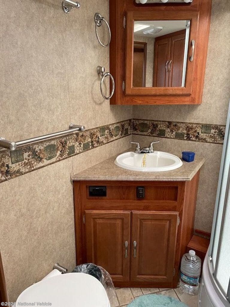 This coach features a bathroom complete with shower, toilet, and a sink with a medicine cabinet above for your convenience.