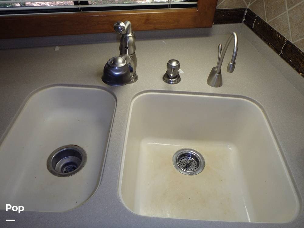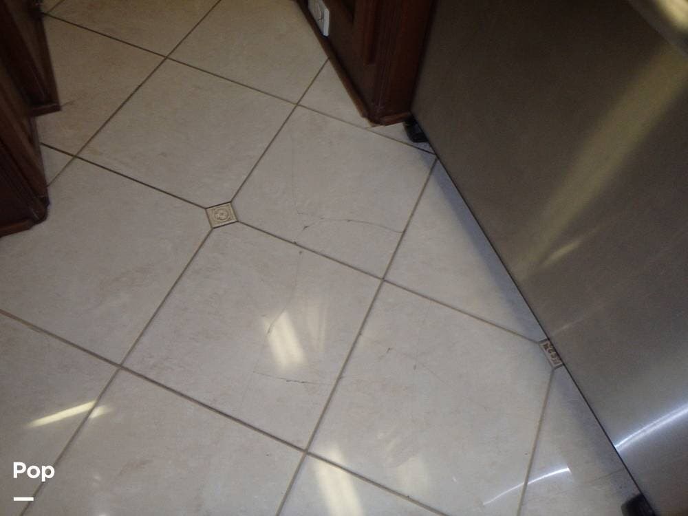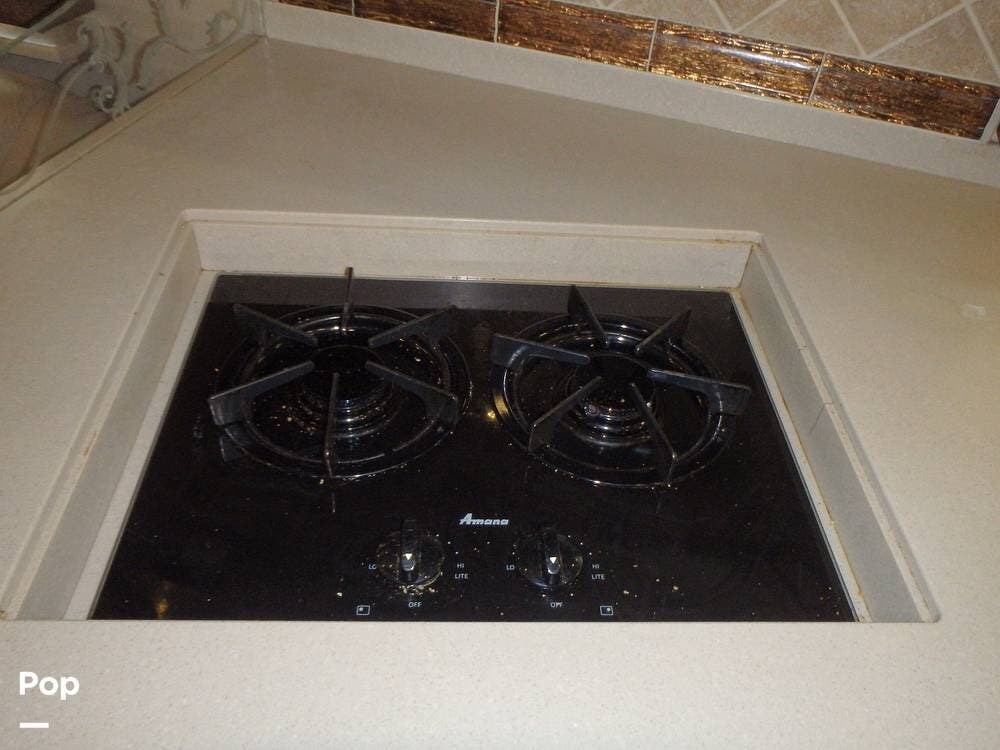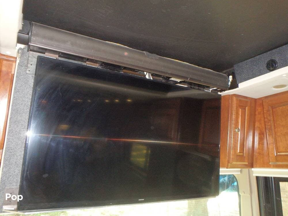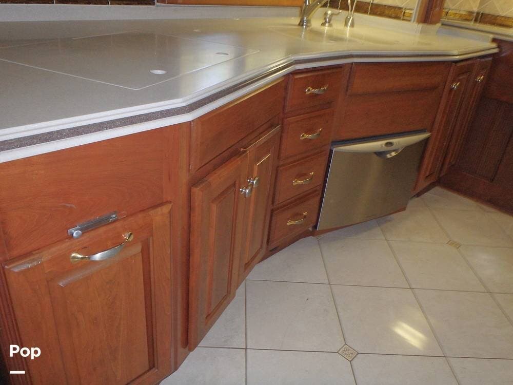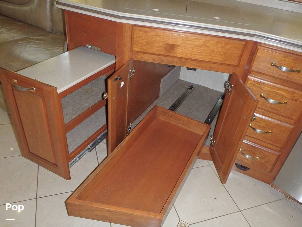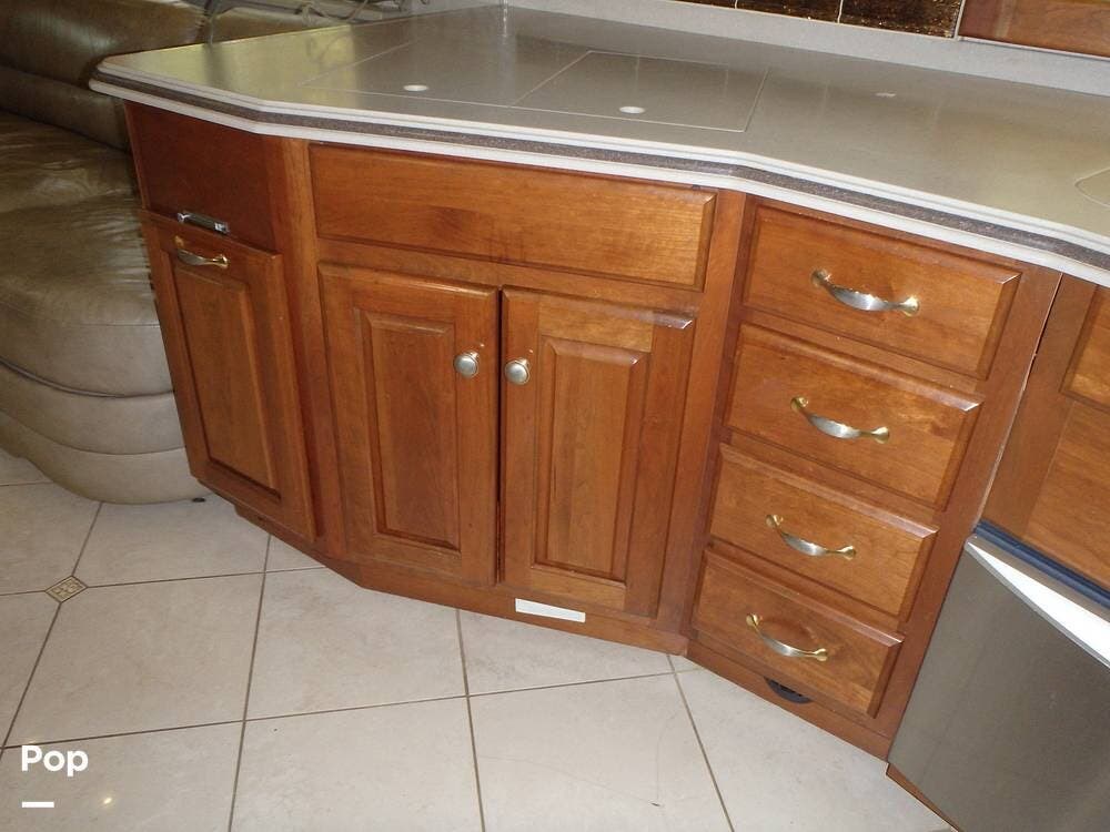 It includes high-quality materials such as solid wood cabinetry, marble tile flooring, and Corian countertops. The living area has a sleeper sofa bed and an entertainment center with a flat-screen TV and surround sound.