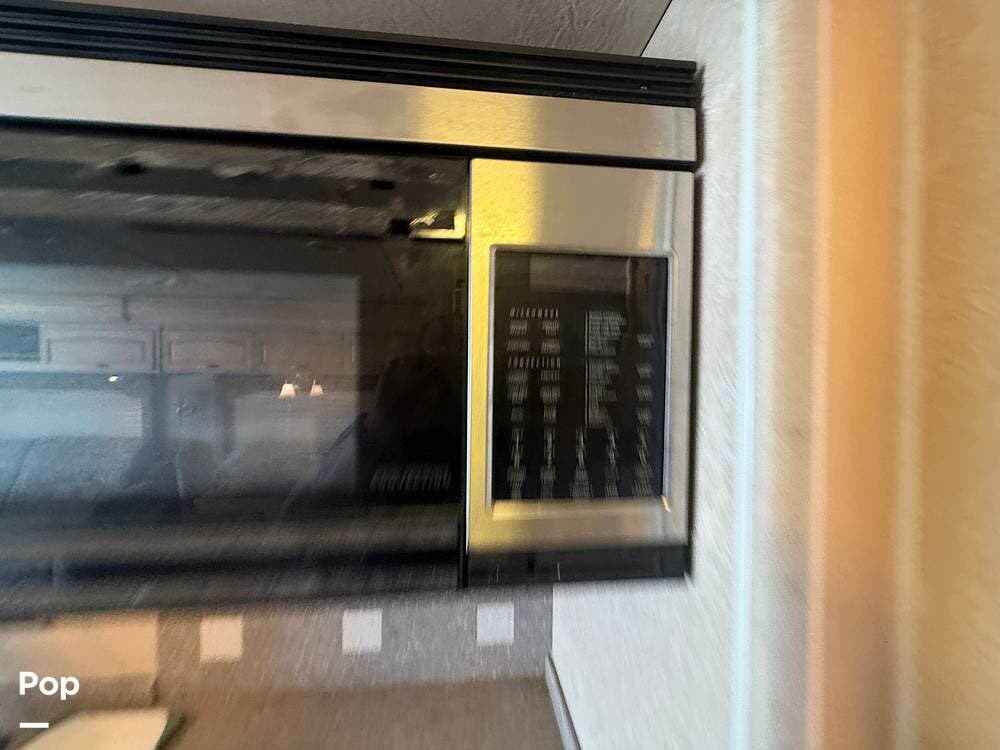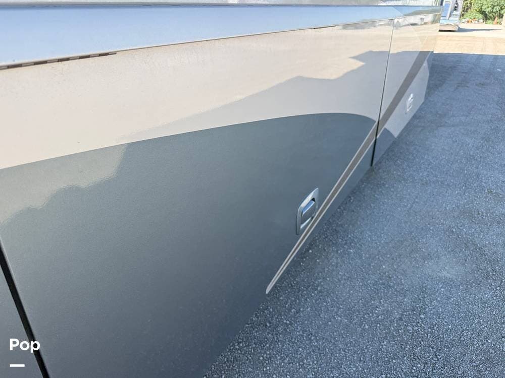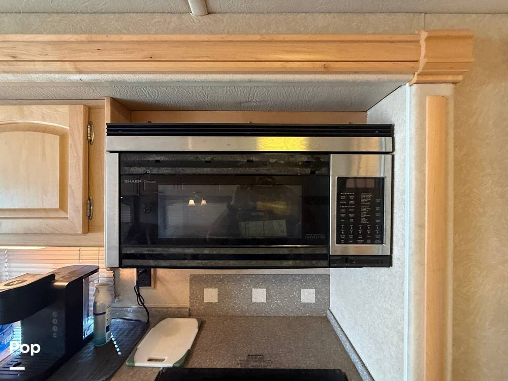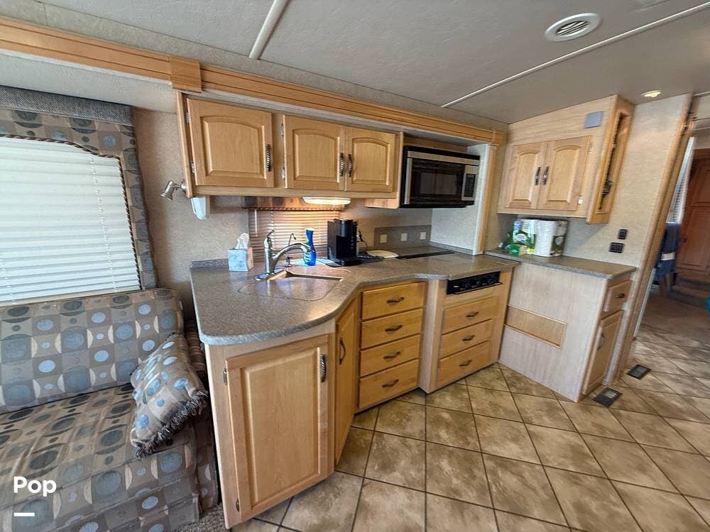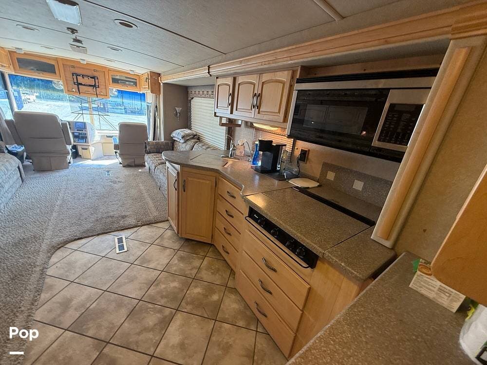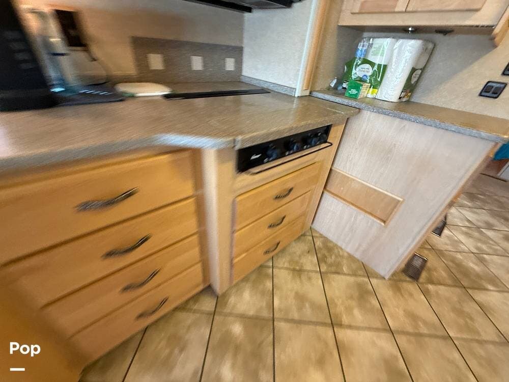 Residential features, such as solid surface countertops, real wood cabinets, and trim, really add to the luxurious feel of this motorhome.