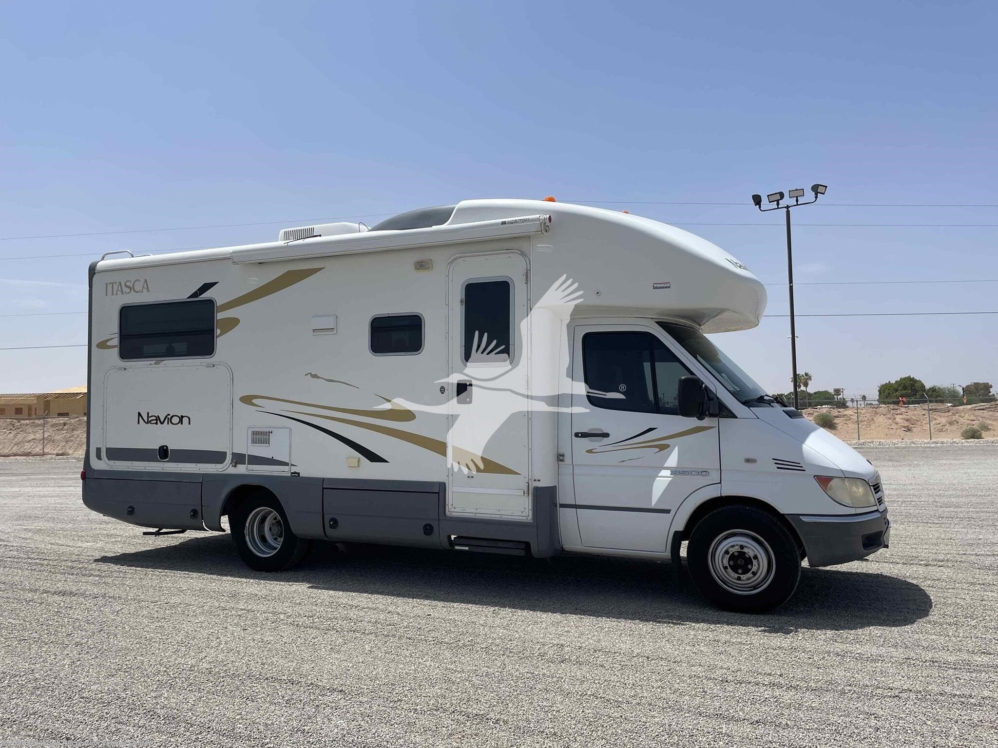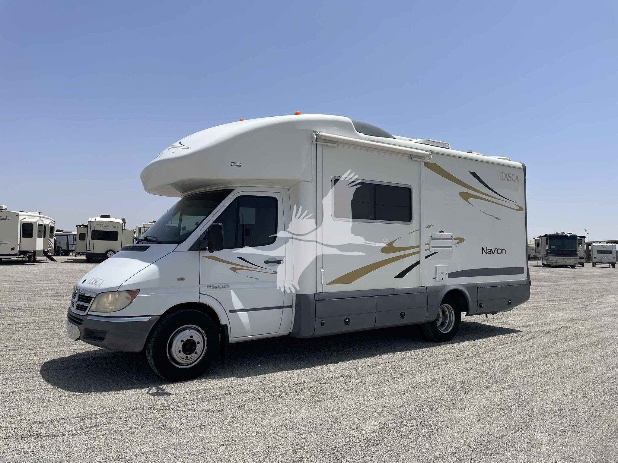 ****STK#: CW18765A.**** How do you improve a coach that is so innovative its introduction created a whole new category of motor homes? Start by creating new floorplans. Then, increase the list of available features to allow for further functionality. Lastly, for good measure, incorporate even more intelligent design. Now you have the 2007 Navion. A powerful and efficient Mercedes-Benz® 2.7 liter 5 cylinder turbo-diesel engine is the hallmark of the Dodge® Sprinter chassis on which the Navion is built. The Dodge® Sprinter chassis is built around a turbodiesel engine that delivers an uncommonly quiet performance with an estimated 17 to 19 miles per gallon and extended service intervals. An exceptionally smooth ride is due to the independent front suspension system with a transverse mono-leaf spring and stabilizer. Tip-shift technology allows manual shifting of the 5-speed automatic electronic transmission if the desire arises. And SmartSpace™ design, with features such as the sofa/sleeper, makes the Navion as much fun at the campsite as it is on the road. The 23J has a dinette/bed slide-out, corner bed, and cab-over-bed so it can sleep up to 6 people. The front swivel cab seats create a welcoming living space with room for a user-friendly galley. Features on this 23' 5" fuel efficient Class C motorhome include 13.5k btu Roof AC, Back-up Monitor & camera, Patio Awning, Onan 3.6 KW LP Generator, Window Roller Shades, Euro Style 2-burner Cook Top w/Lid, 2 Door Refrigerator, LCD TV, Stereo CD/DVD, Interior and Exterior Lights, Ultraleather Furniture, Roof Access Ladder, and more.