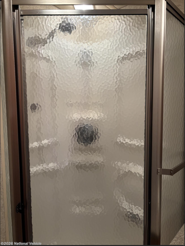 This coach features a bathroom complete with shower, toilet, and a sink with a medicine cabinet above for your convenience.