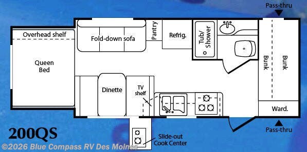 Rear Queen Bed Slideout, Fold Down Sofa, Booth Dinette w/TV Shelf Above, Slide-Out Cook Center, Double Kitchen Sink, 3 Burner Range, Pantry, Refrigerator, Tub/Shower, Lav., Front Bunks, Pass-Thru Storage, Wardrobe & More.