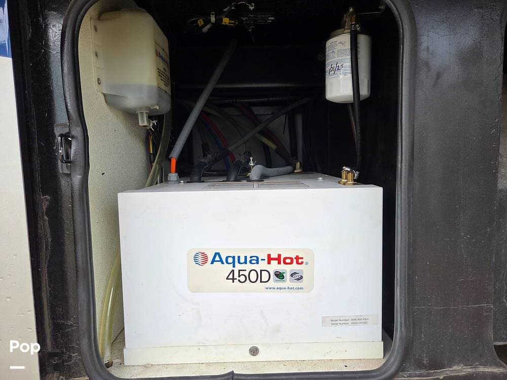 The bedroom is a true retreat with a king-size bed and a 32" TV for ultimate comfort. The refrigerator/Freezer ensures you can store fresh groceries for longer trips, while the Aqua Hot 450-DE heating system, powered by diesel or electricity, provides reliable warmth. There's also a spacious bathroom with plenty of storage and a combination washer/dryer located in the Bedroom.