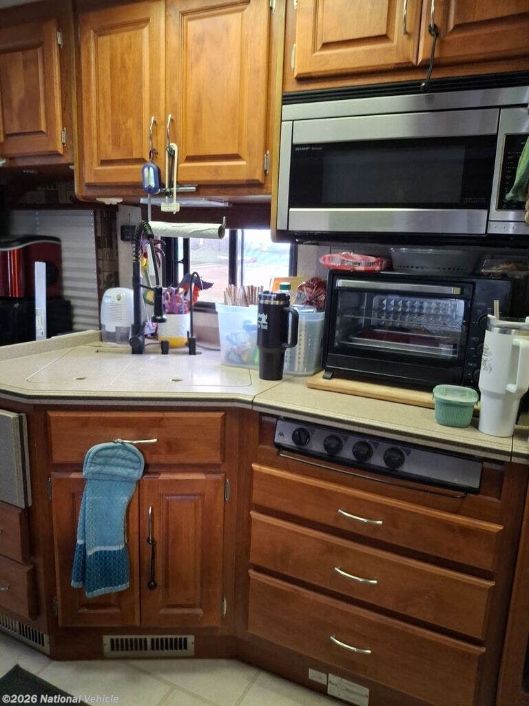 The kitchen is well-appointed with Corian-style solid-surface countertops (including front and bath areas), a double sink, 3-burner range, convection microwave, and refrigerator/freezer?making it easy to cook wherever you roam.
