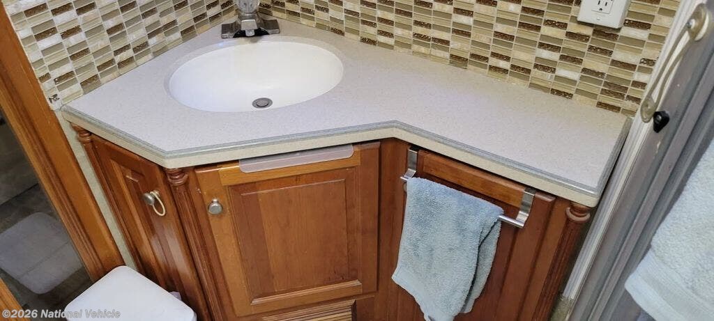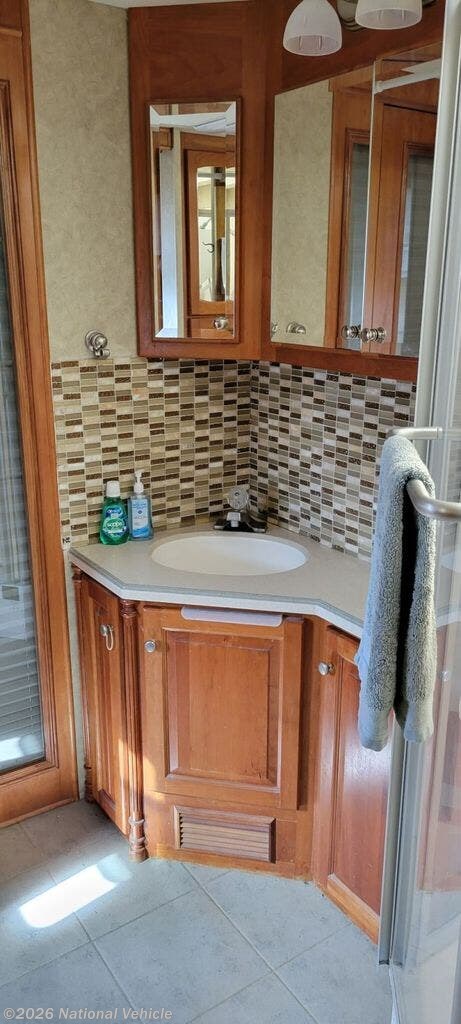 This coach features a bathroom complete with shower, toilet, and a sink with a medicine cabinet above for your convenience.