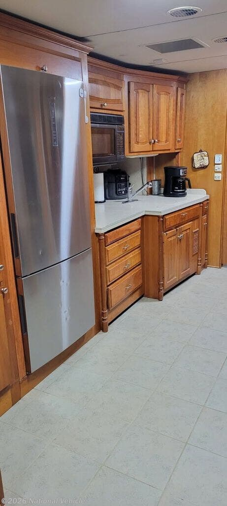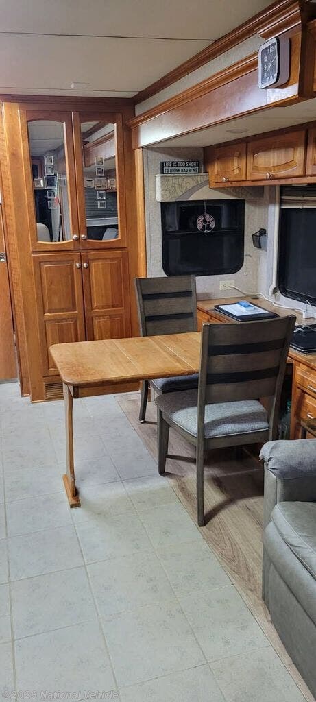 Step inside and take a look back at all of the convenient features that would make any journey enjoyable. The kitchen area features everything you need to prepare great meals on the go including a sink, a three burner range with microwave/convection oven, and a residential refrigerator/freezer. There is also plenty of storage for all of your dry and canned goods. Have a seat at the comfortable free standing dinette, where you can enjoy meals with your family.