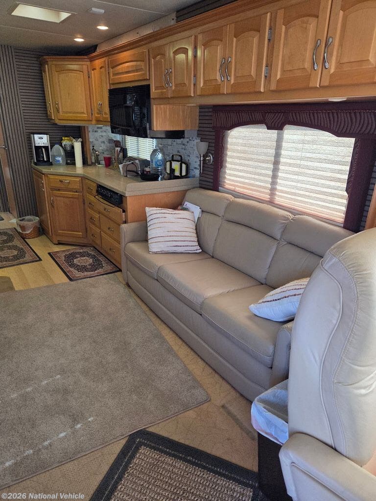 At 36 feet, this coach offers a spacious interior with multiple slide-outs, creating a true residential feel. The living area is warm and inviting, featuring comfortable seating, solid wood cabinetry, and plenty of natural light. The fully equipped kitchen includes generous counter space, a full-size refrigerator, stove, oven, and microwave?perfect for cooking on the road.