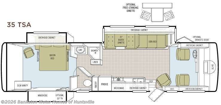 Triple Slide Class A Motorhome w/Rear Queen Bed w/Nightstands Slideout, Lounge Chair, Wardrobe w/Opt. 20" TV Slideout, Desk/Vanity, Private Toilet Area, Lav., Angle Shower, Linen Cabinet, Booth Dinette or Opt. Free Standing Dinette & Sofa Bed Slideout, Pantry, Refrigerator, Double Kitchen Sink, Lounge Chair, TV Above Cab Area, Overhead Cabinets Both Driver & Passenger Side, Opt. Driver Door and Much More. Ford Specs Shown. See us for Workhorse or Freightliner Diesel Choices.