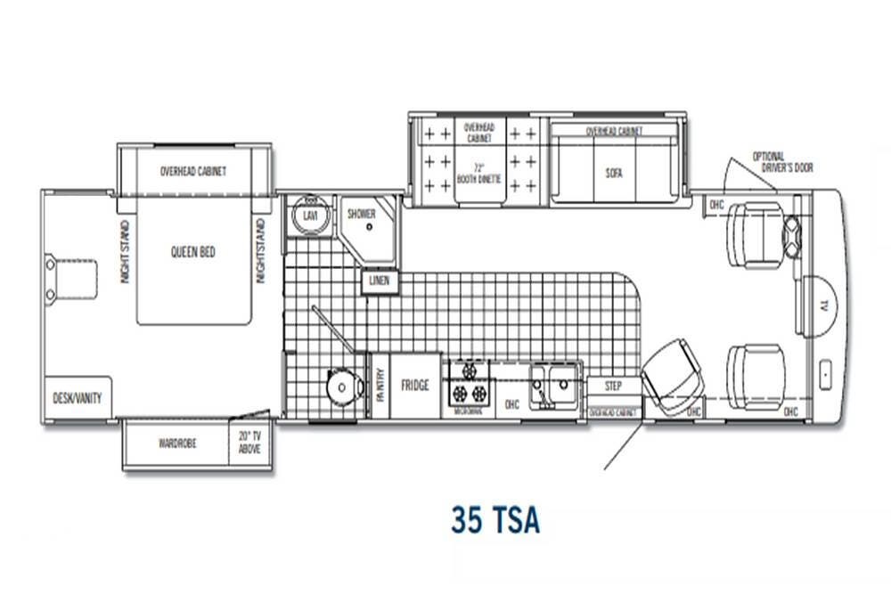The living area has a sleeper sofa, and the dinette quickly converts into a third sleeping area if needed. The TV is mounted above the driver/passenger area - and the area is carpeted with vinyl flooring in the Galley and Bathroom areas.