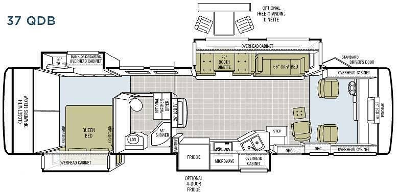 The QDP floor plan features opposing side slides that, when open, create an ample living space in both bedrooms and the galley/living area. This coach has the optional freestanding dinette. The large bath is also a really nice feature in this motorhome.