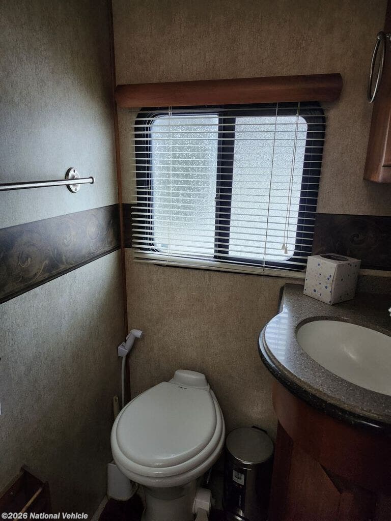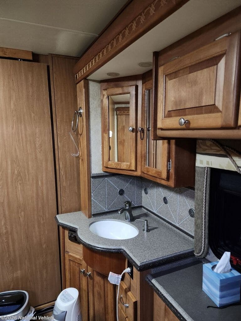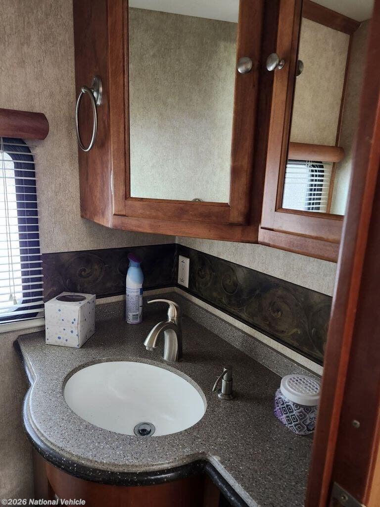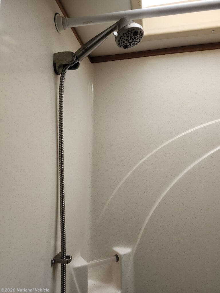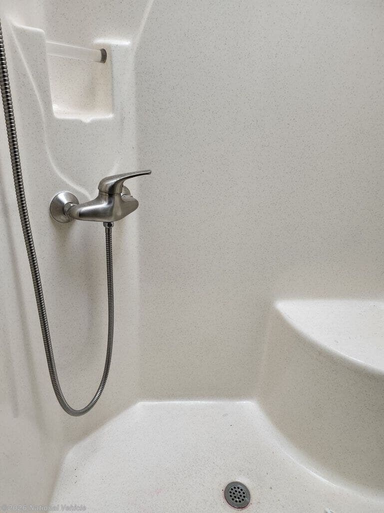 This coach features a bathroom complete with shower, toilet, and a sink with a medicine cabinet above for your convenience.