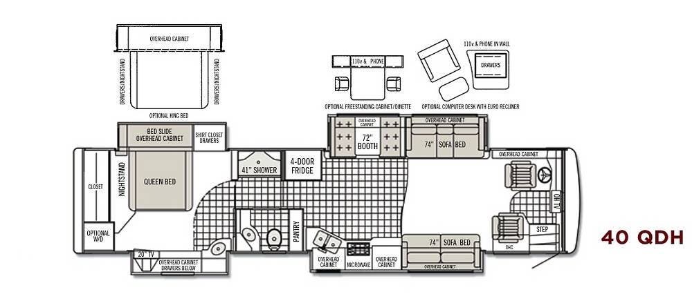 Outside, the Phaeton 40QDH is built with a full-body paint exterior, fiberglass sidewalls, and aluminum wheels for durability and a polished appearance. It also includes full pass-through basement storage and a raised-rail chassis for additional cargo capacity.