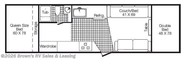 Rear Queen Bed w/Storage, Wardrobe, Tub/Shower, Lav., Kitchen Sink, Refrigerator, 3 Burner Range, Couch/Bed, Extended Table, 2nd Sofa, Front Double Bed, Opt. 3 Drawer Dresser, Opt. Hanging Cabinet and Much More.