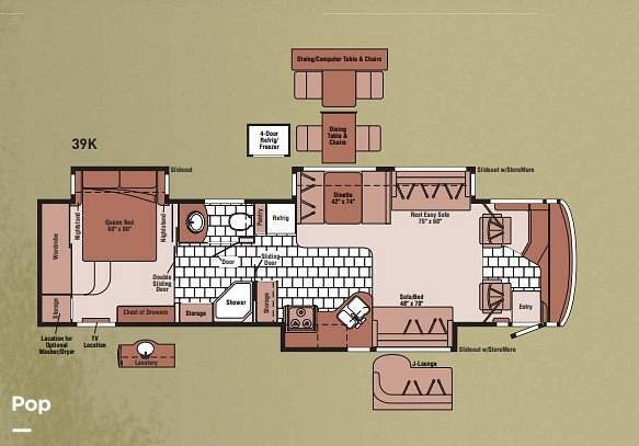 The 39K rides on a Freightliner chassis with a 350 HP Caterpillar diesel and Allison 6‑speed, giving you confident highway manners, strong towing capacity, and the stability people expect from a true diesel pusher.