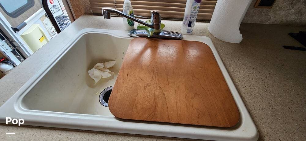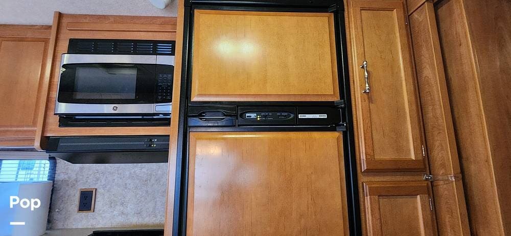 The 2007 Sightseer 35J has a well-appointed kitchen. It has a microwave convection oven, stove, oven, refrigerator, double kitchen sink, and plenty of cabinet space.