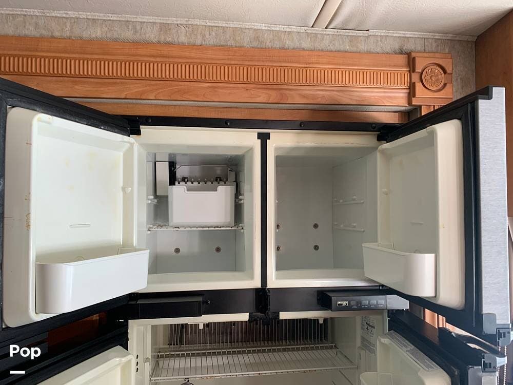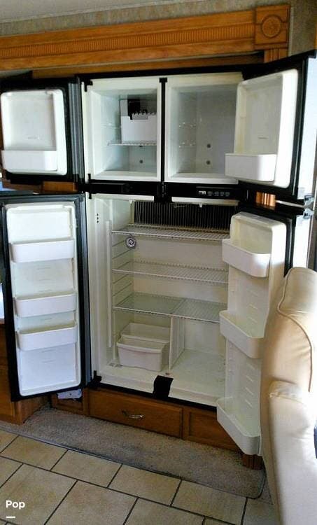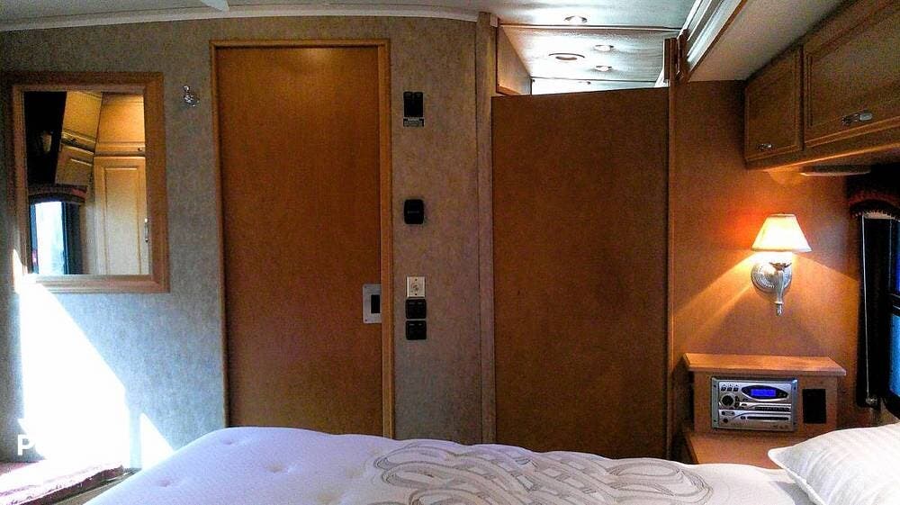 This coach has all the comforts of home, including a 4-door refrigerator/freezer, central A/C and heat, central vacuum, and queen-size bed.