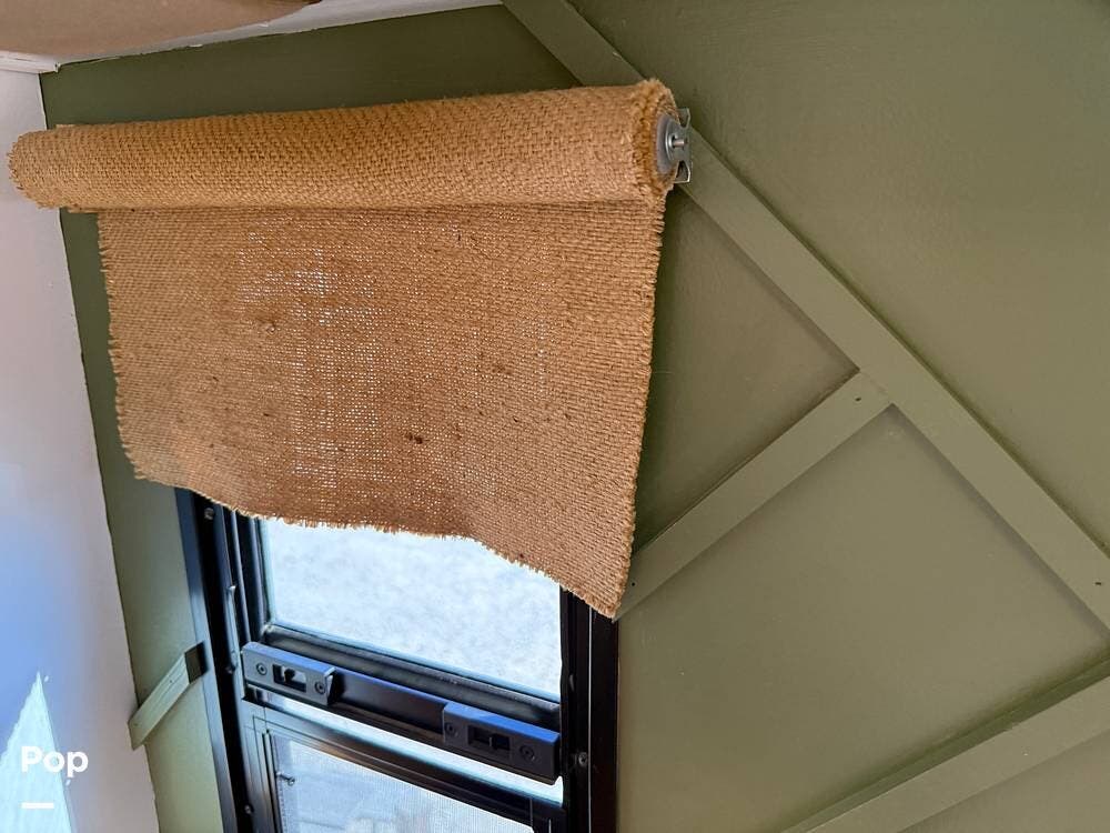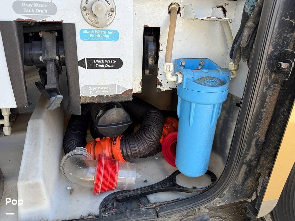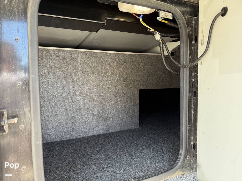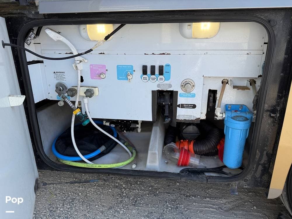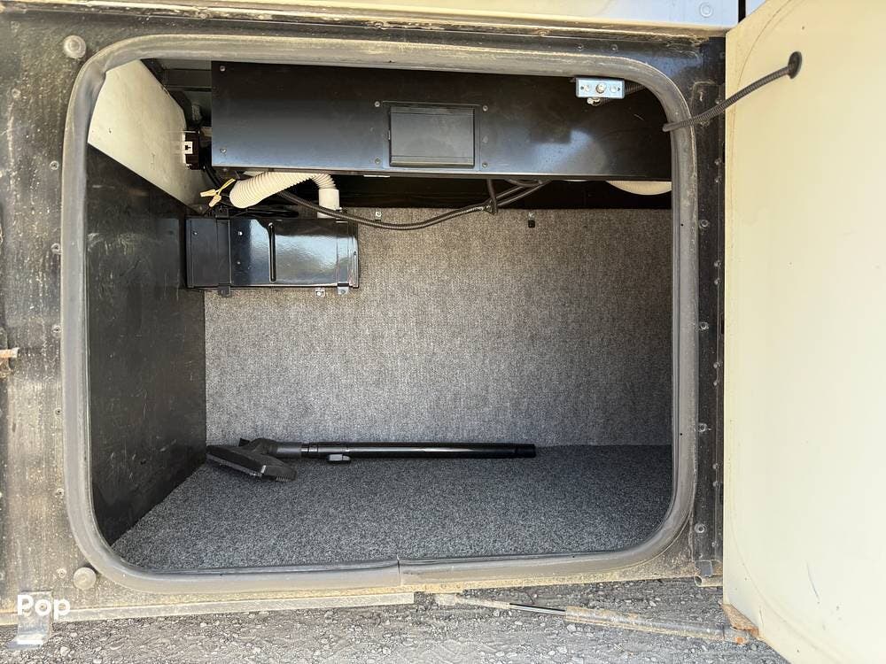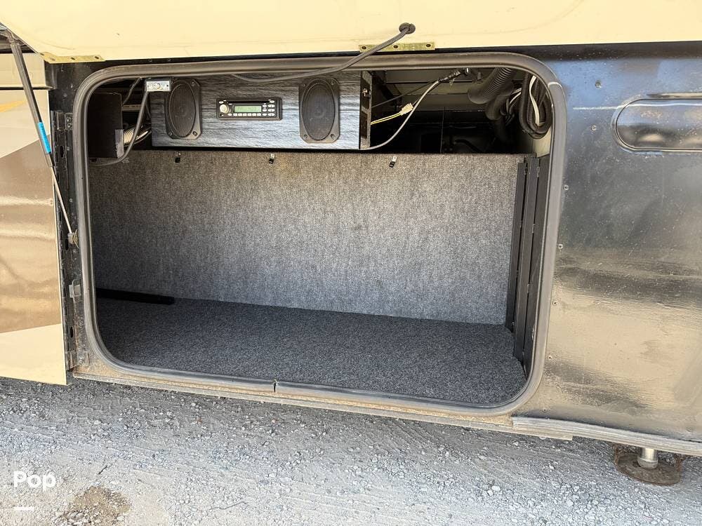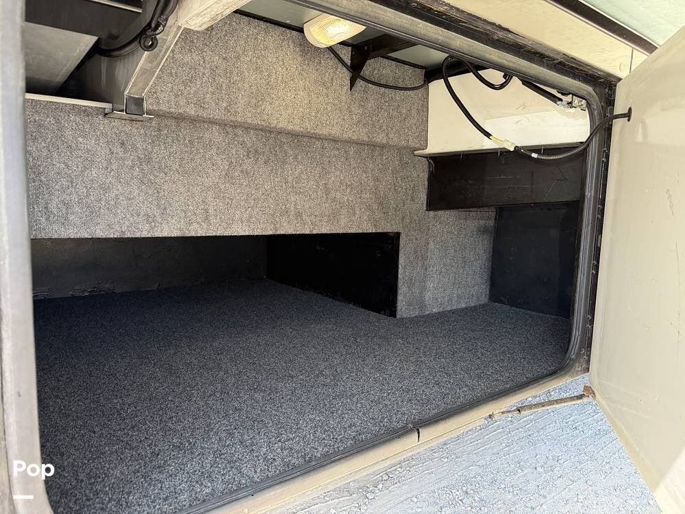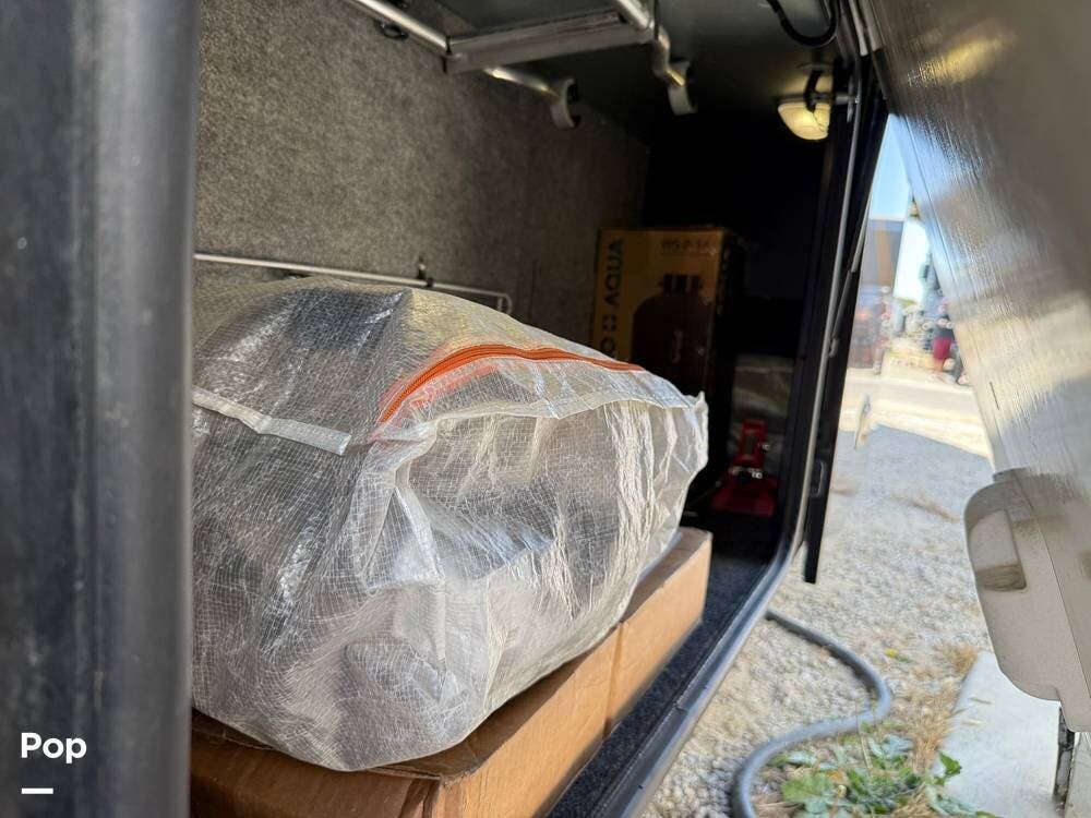 The exterior storage is easy to access, with a slide tray that operates from both sides. When not in use, she is stored indoors within the seller's RV garage.