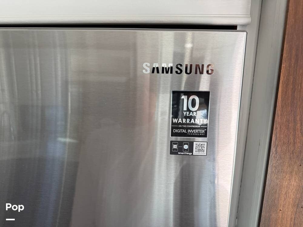 The galley is forward and well laid out, with solid-surface countertops, a residential-sized electric refrigerator, a freezer with an ice maker, and an adjacent custom wood bar and stools.