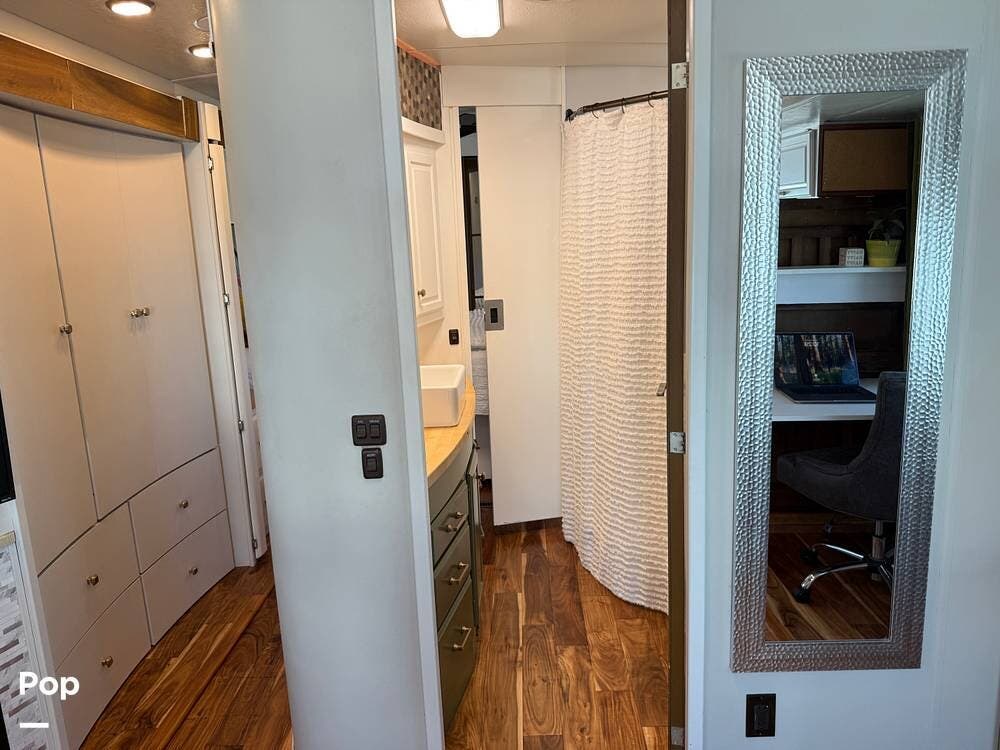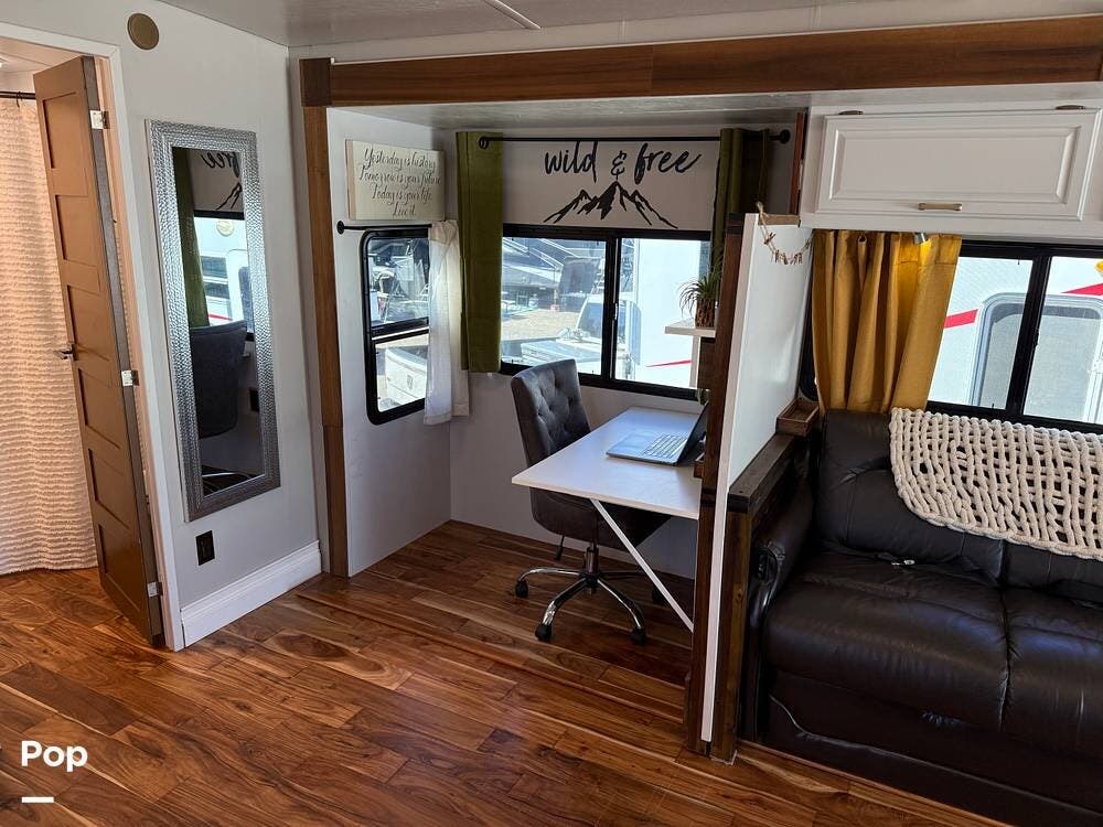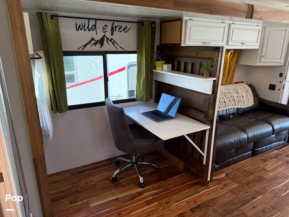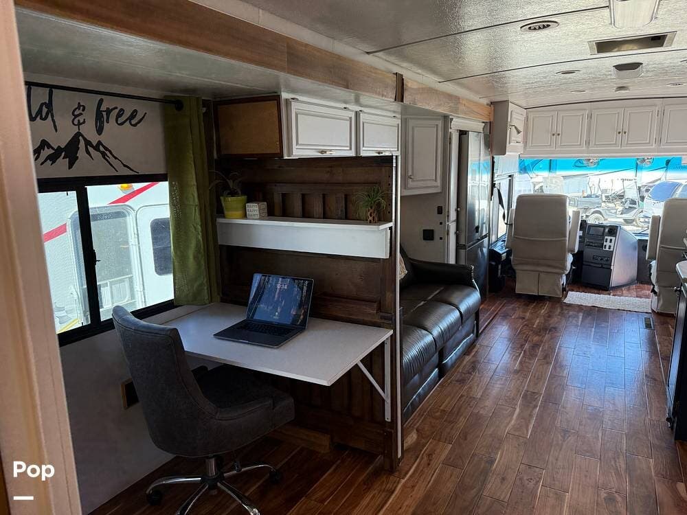 The interior features wood flooring throughout, a Custom Desk/workstation, and an Ultra-Leather Power-Operated Sleeper Sofa.