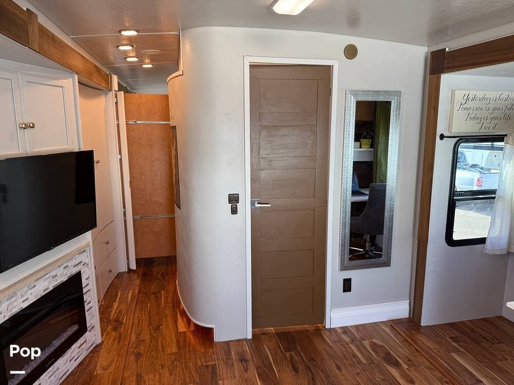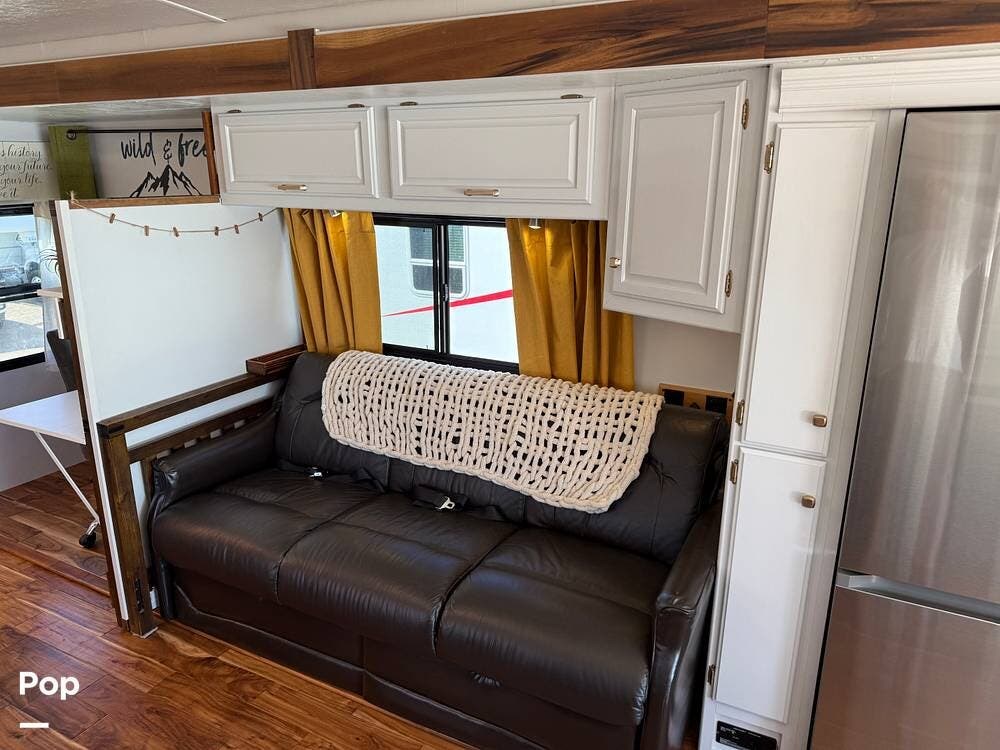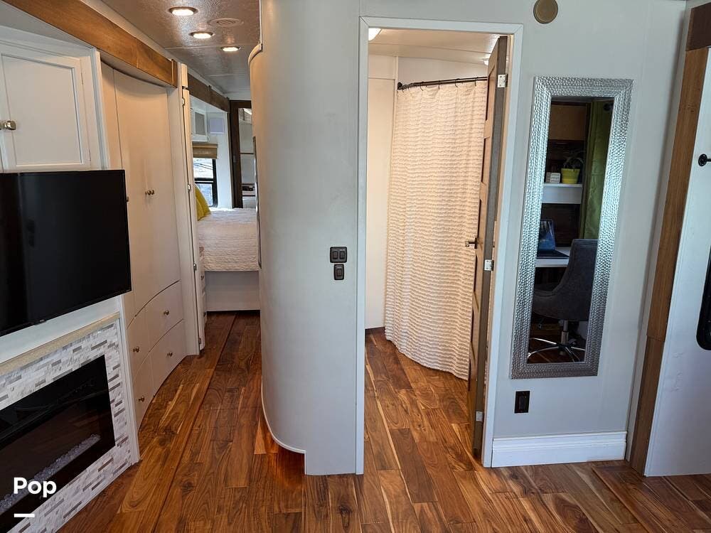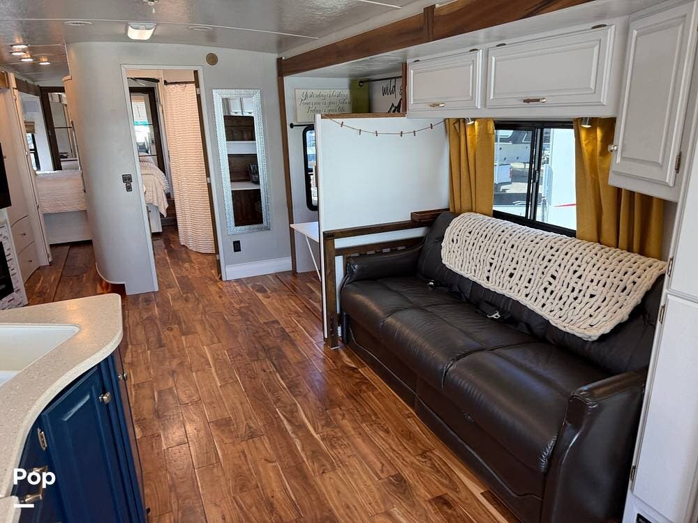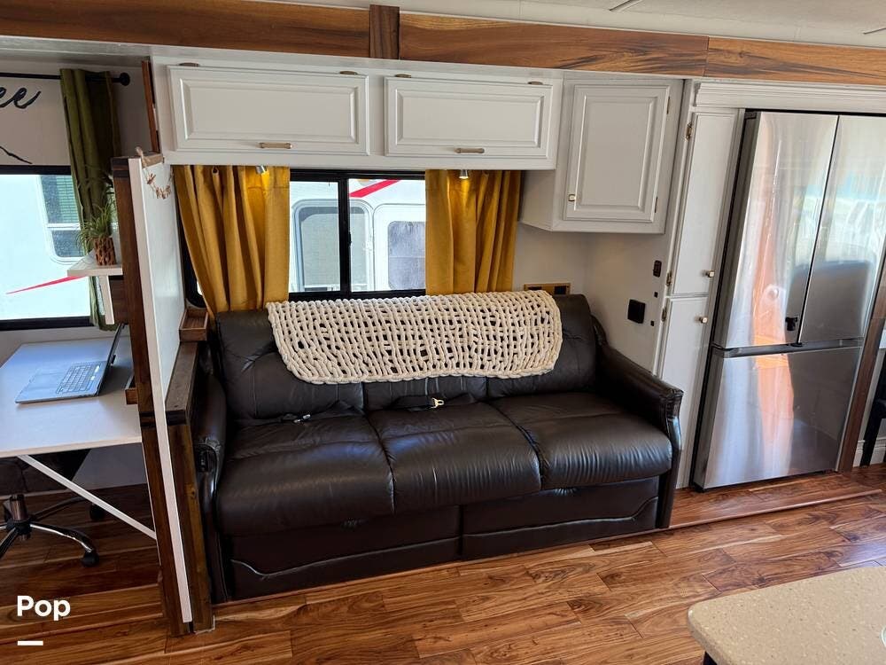 The interior features wood flooring throughout, a Custom Desk/workstation, and an Ultra-Leather Power-Operated Sleeper Sofa.