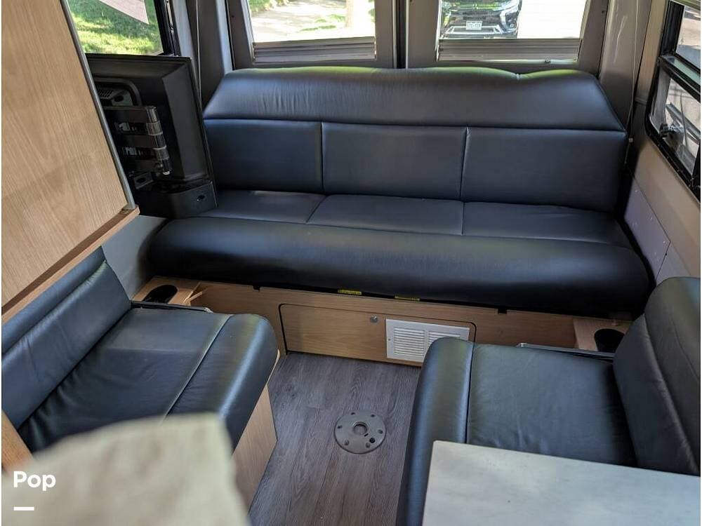 It has a kitchen, bathroom, and rich ultraleather bucket seats that swivel to face a mealtime table for four.