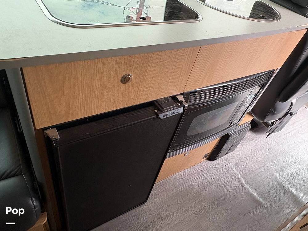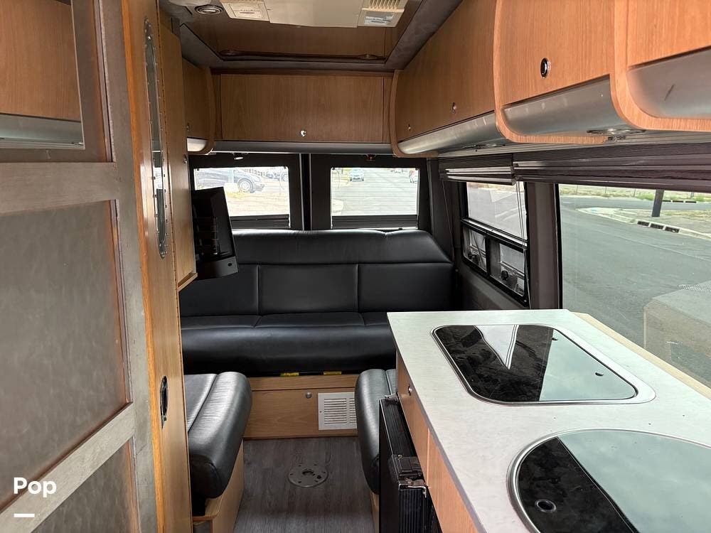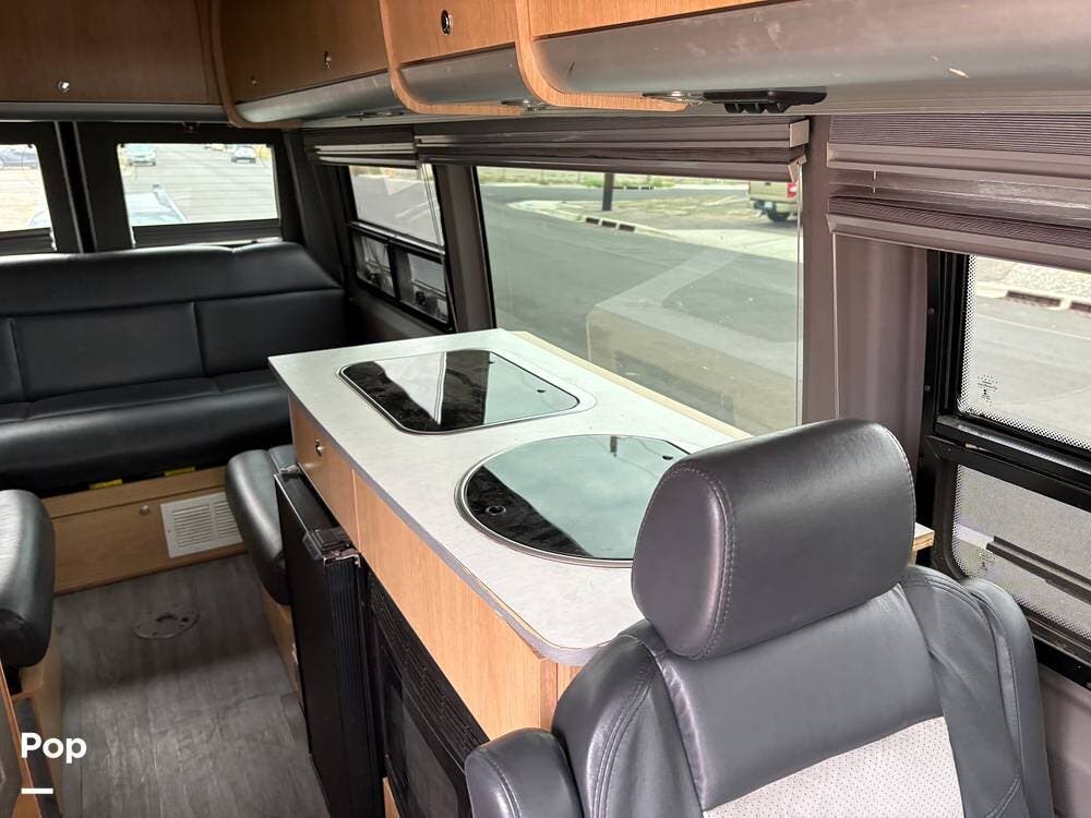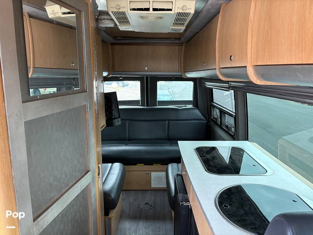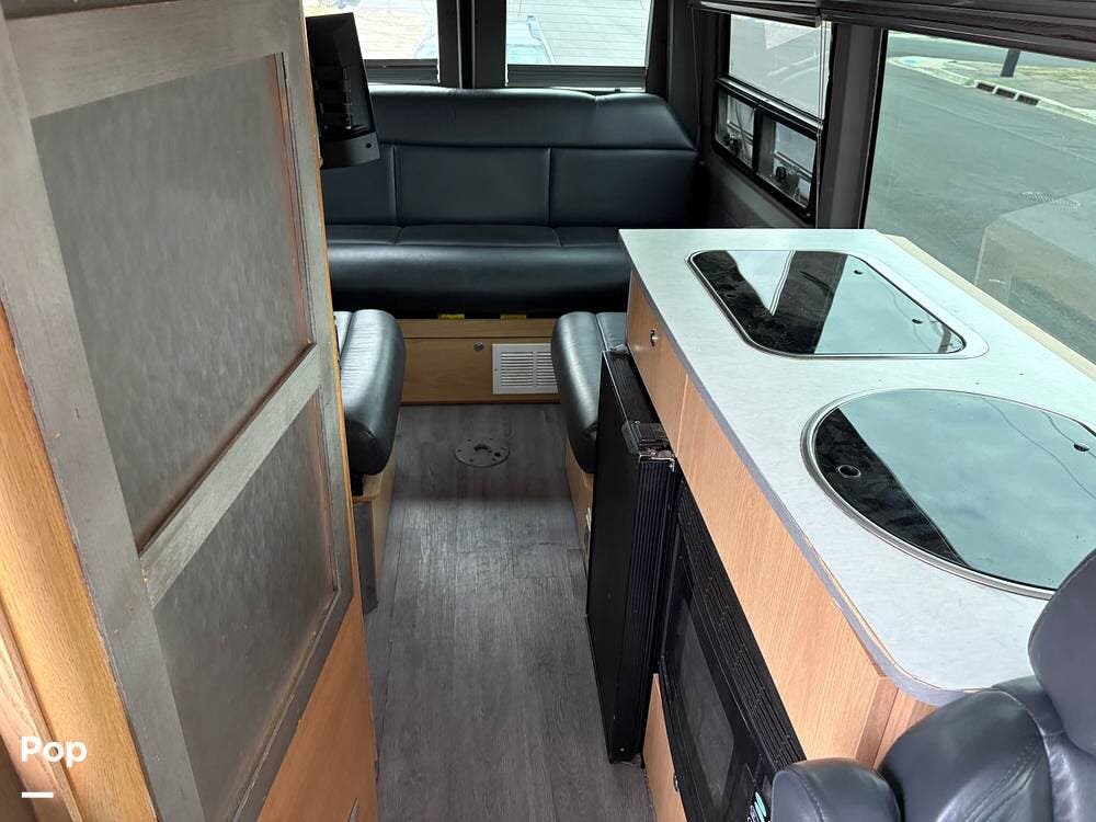 You'll find a sink, a two-burner gas stove, and a compact refrigerator in the kitchen. In the rear of the coach, a flat-screen TV is located while you lounge on the leather sofa.
