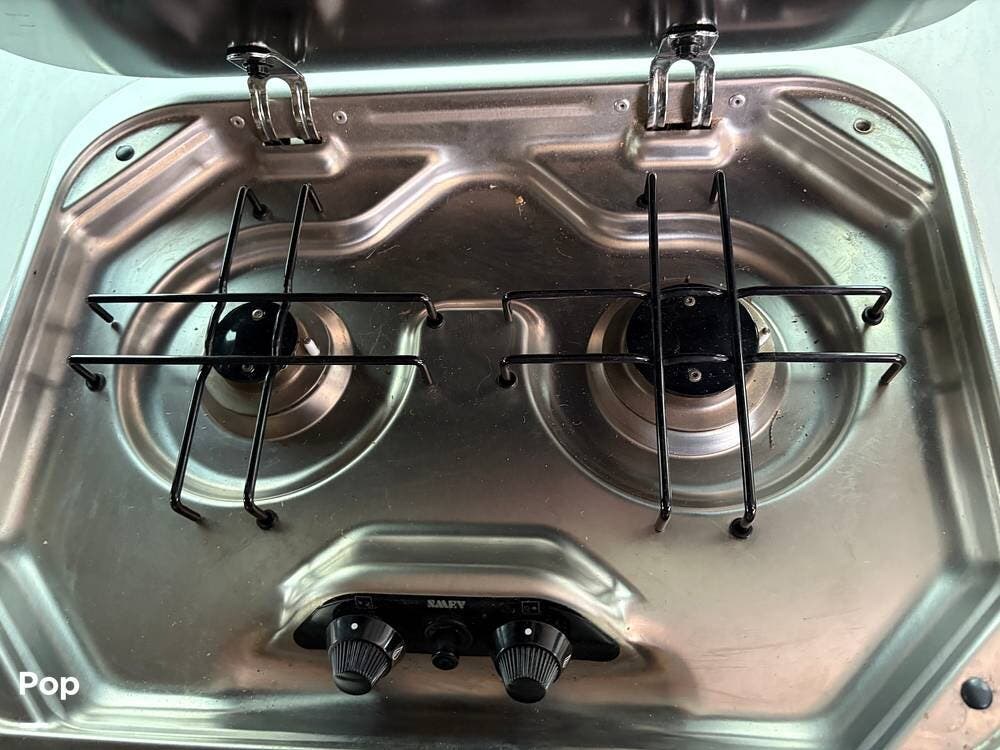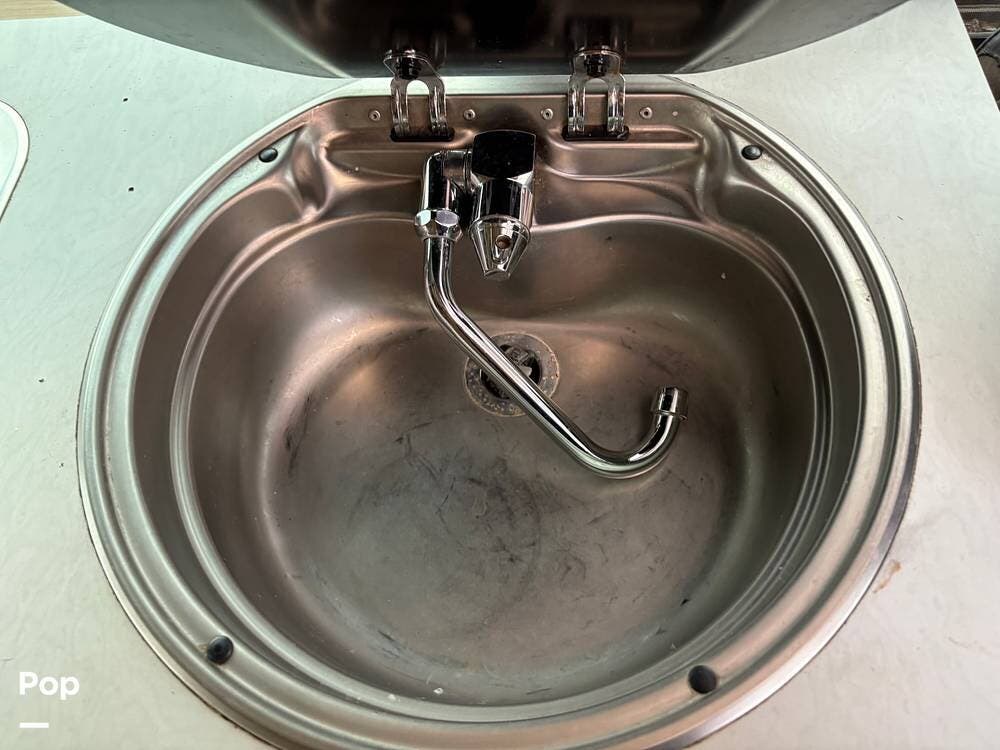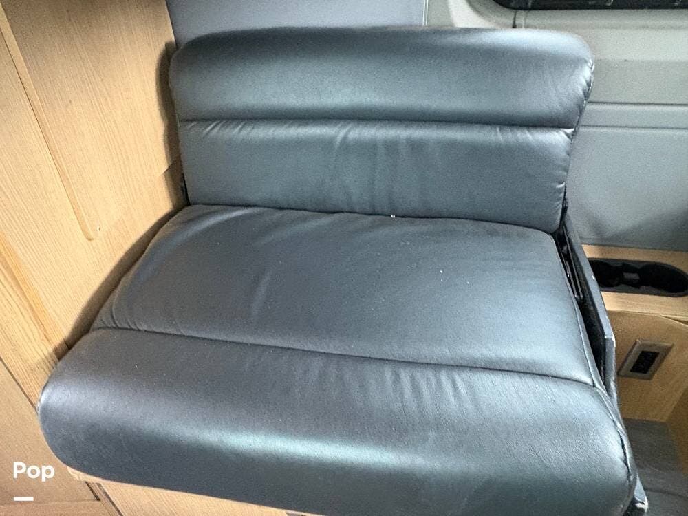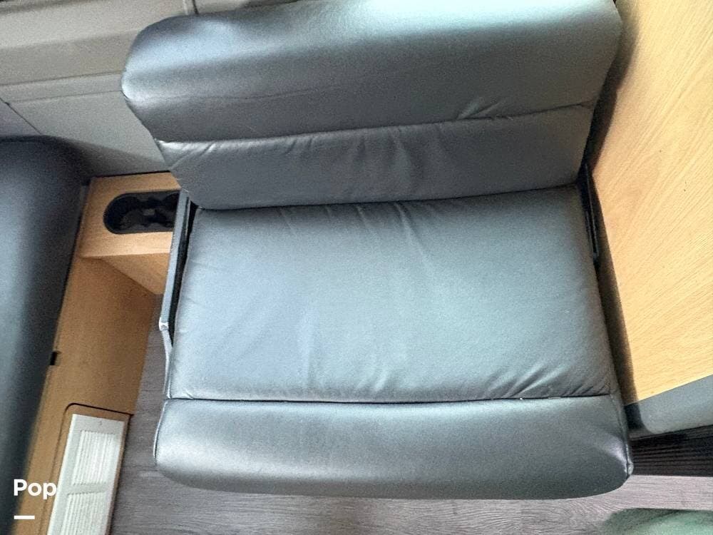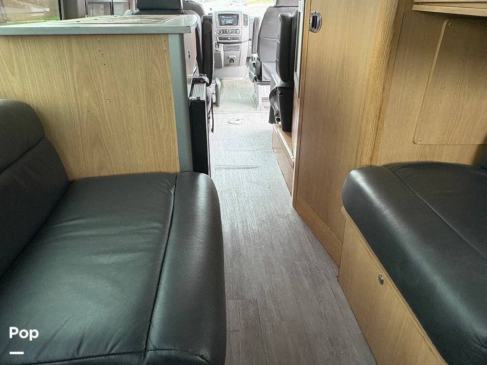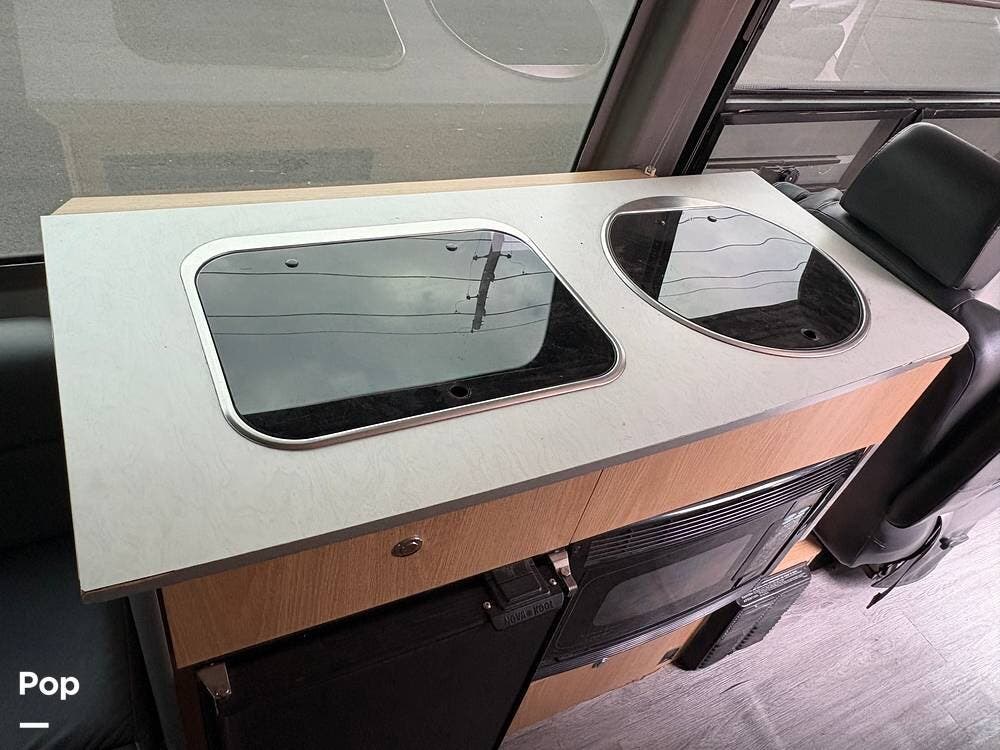 You'll find a sink, a two-burner gas stove, and a compact refrigerator in the kitchen. In the rear of the coach, a flat-screen TV is located while you lounge on the leather sofa.