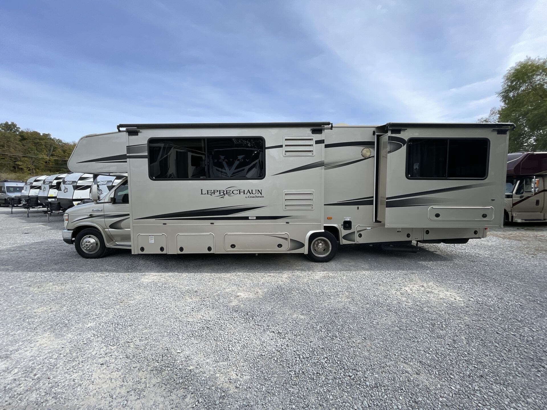 Double Slide Leprechaun Motor Home by Coachmen, Rear Queen Bed Slideout w/Nightstand, Wardrobe, LCD TV, Shower, Private Toilet Area w/Lav., Refrig. & J-Sofa/Dinette Slideout w/Hi-Lo Table, Skylight, Bunk Over Cab Area, TV Cabinet, Euro Chair, Kitchen Sink, 3 Burner Range, Overhead Cabinets Throughout and More.