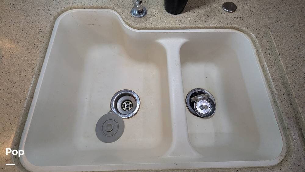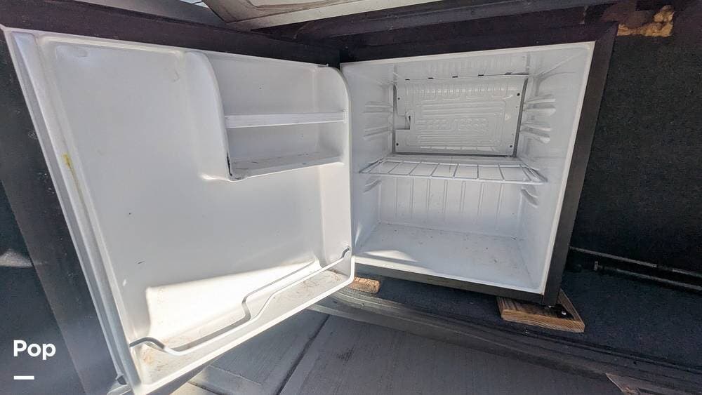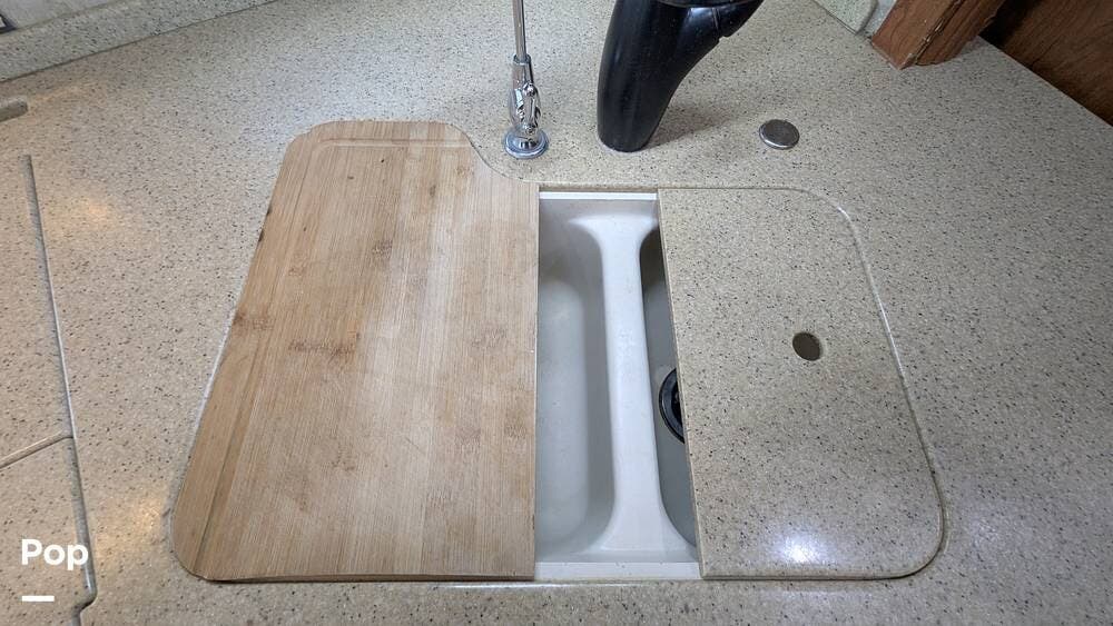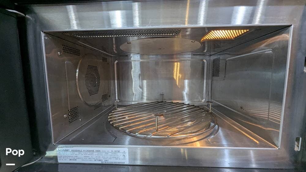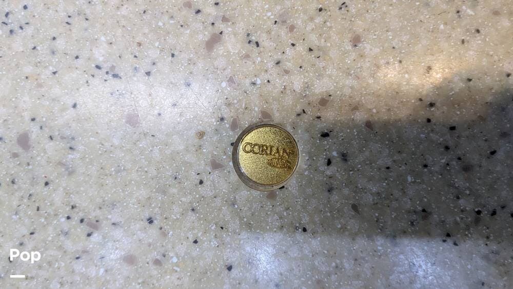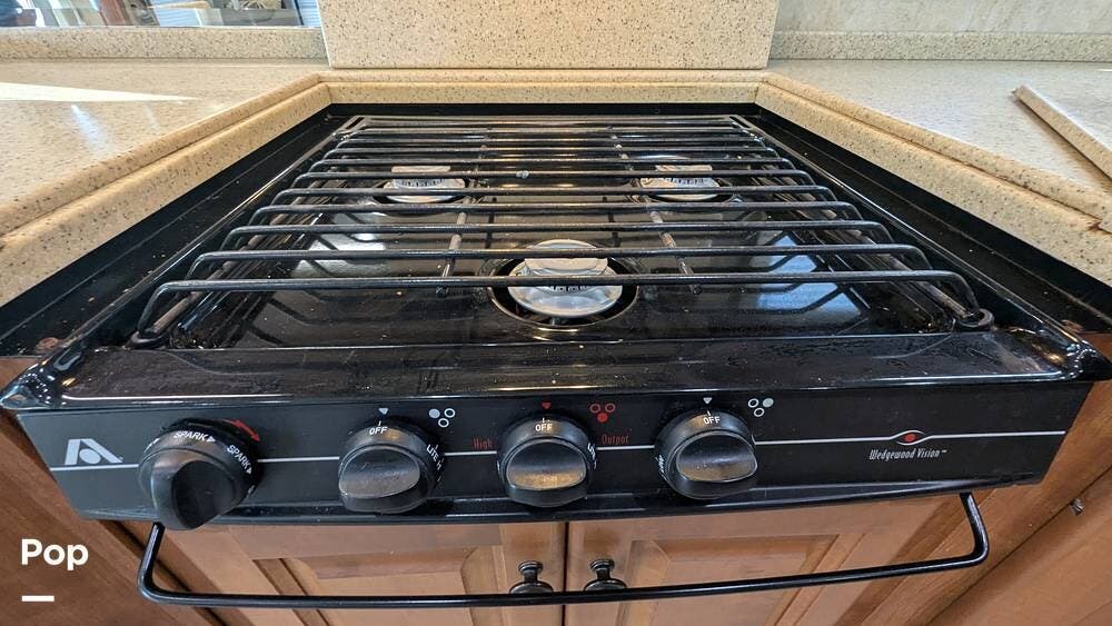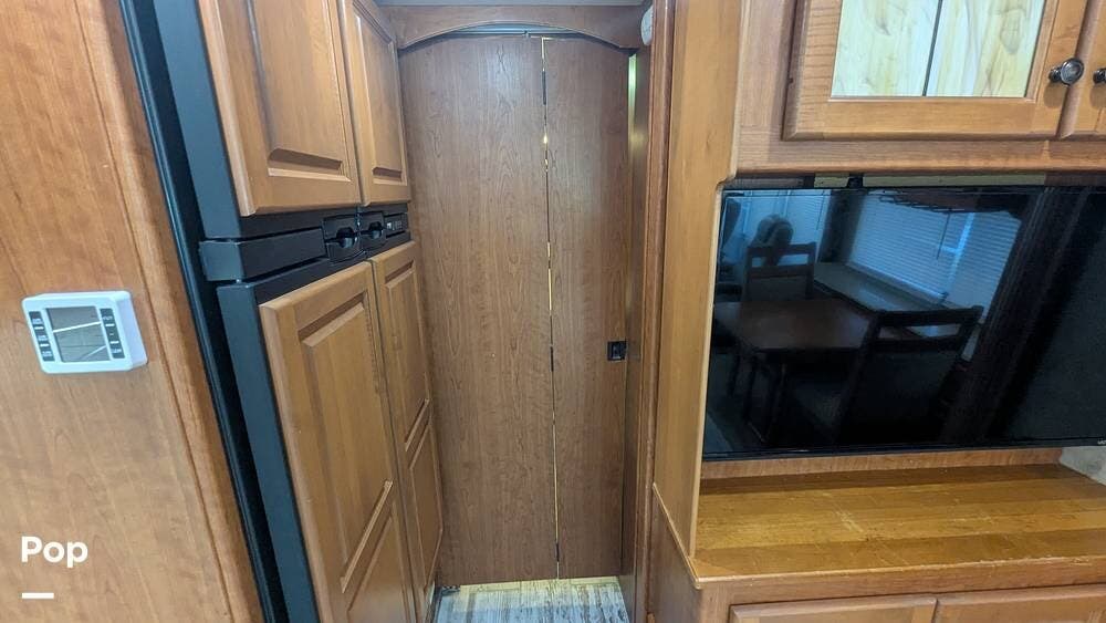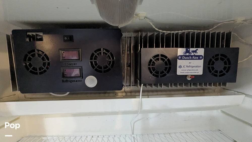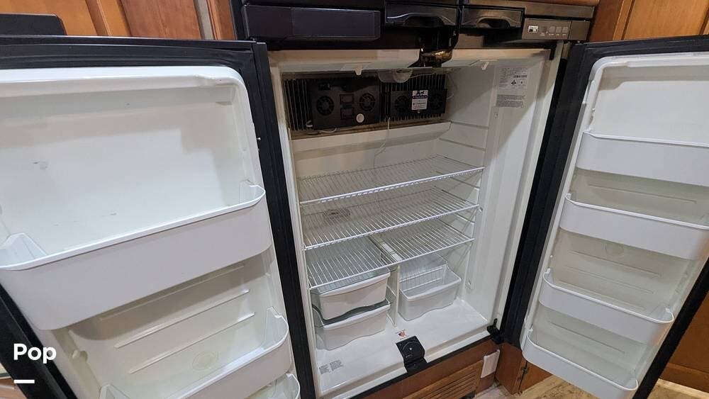 The full-sized refrigerator/freezer has an upgraded Dutch Aire refrigerator-freezer unit trimmed with matching wood. The solid surface countertops are extremely nice, and the wood has a warm, inviting feel.