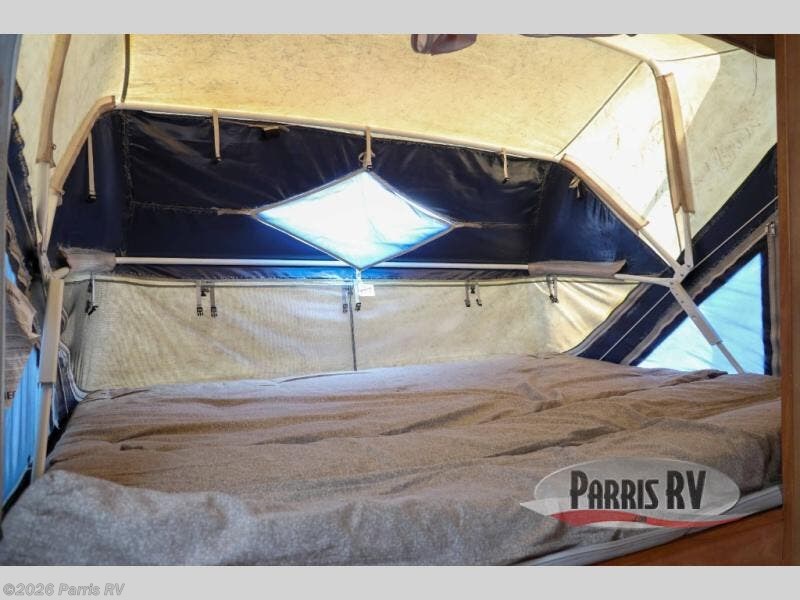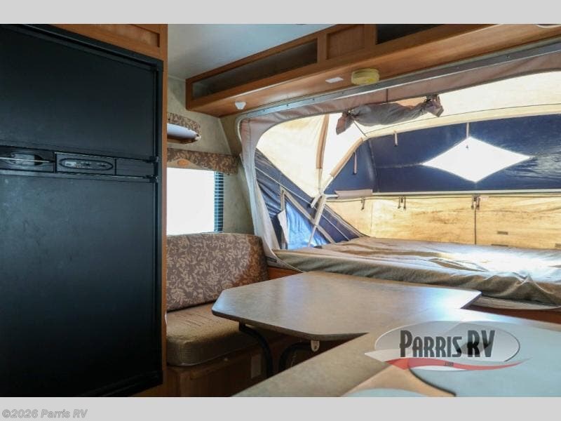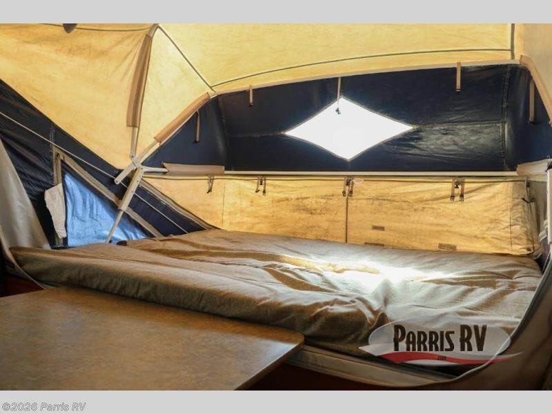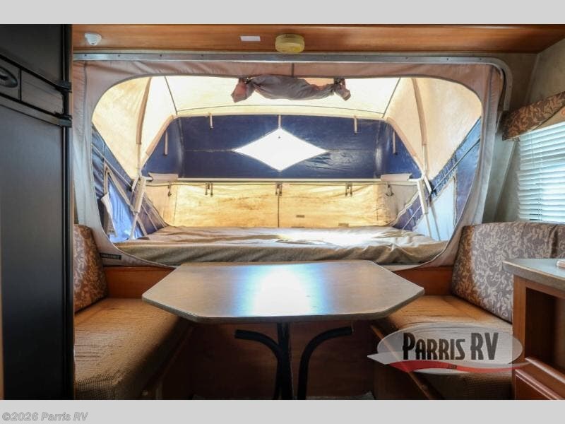 Expandable w/Rear 60" x 80" Queen Bed Tent End, Bathroom, Toilet, Sink, Tub, 3 Burner Range, Double Kitchen Sink, Refrigerator, TV Shelf, Booth Dinette, Front 60'' x 80'' Queen Bed Tent End, and More.