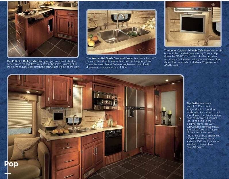 Relax on the 71" x 51" sofa/sleeper or the lounge chair with an ottoman and enjoy the Entertainment Center with a large flat-screen TV and stereo. There is also another flat-screen TV in the cab area.