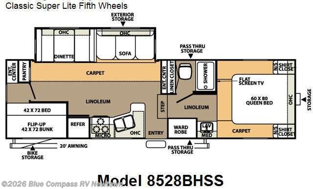 Single Slide Classic Super Lite Bunkhouse Fifth Wheel w/Rear Corner Double Bed w/Bunk Above, Bike Storage, 20' Awning, Ent. Center/Pantry, Booth Dinette & Sofa Slideout, Refrigerator, 3 Burner Range, Double Kitchen Sink, Ent. Center/Linen Closet, Wardrobe, Pass-Thru Storage, Lav., Med. Cabinet, Shower, Front Queen Bed w/Shirt Closets Above Nightstands, Flat Screen TV and Much More.