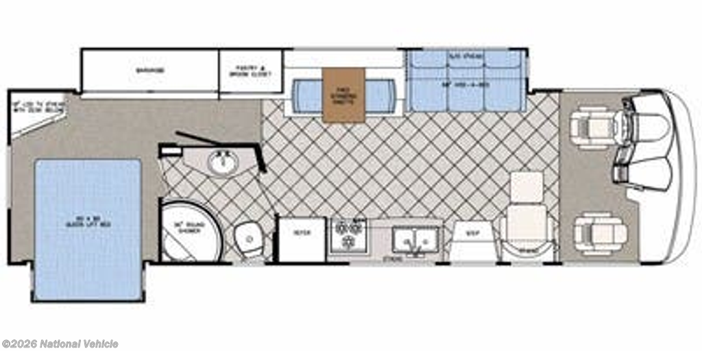 The coach features two slide-outs with toppers that greatly expand the living space, full body paint for a sleek, upscale exterior, and auto power leveling for easy setup. Stay comfortable in all climates with roof and cab AC units, a furnace, and an ONAN 7.5KW diesel generator supported by new house and chassis batteries and a Xantrex inverter.