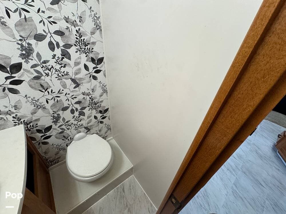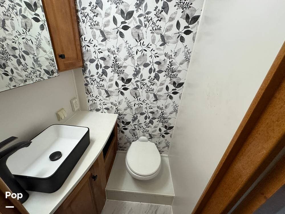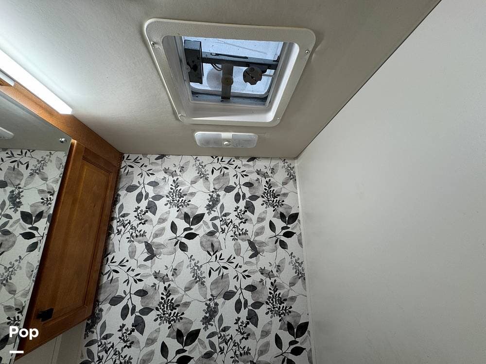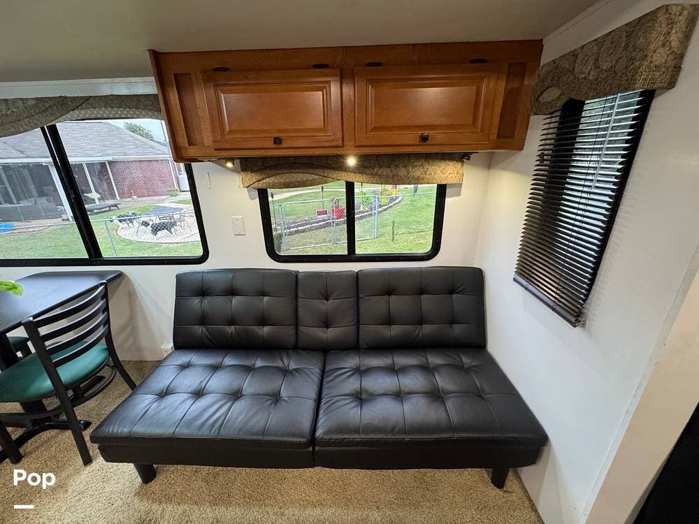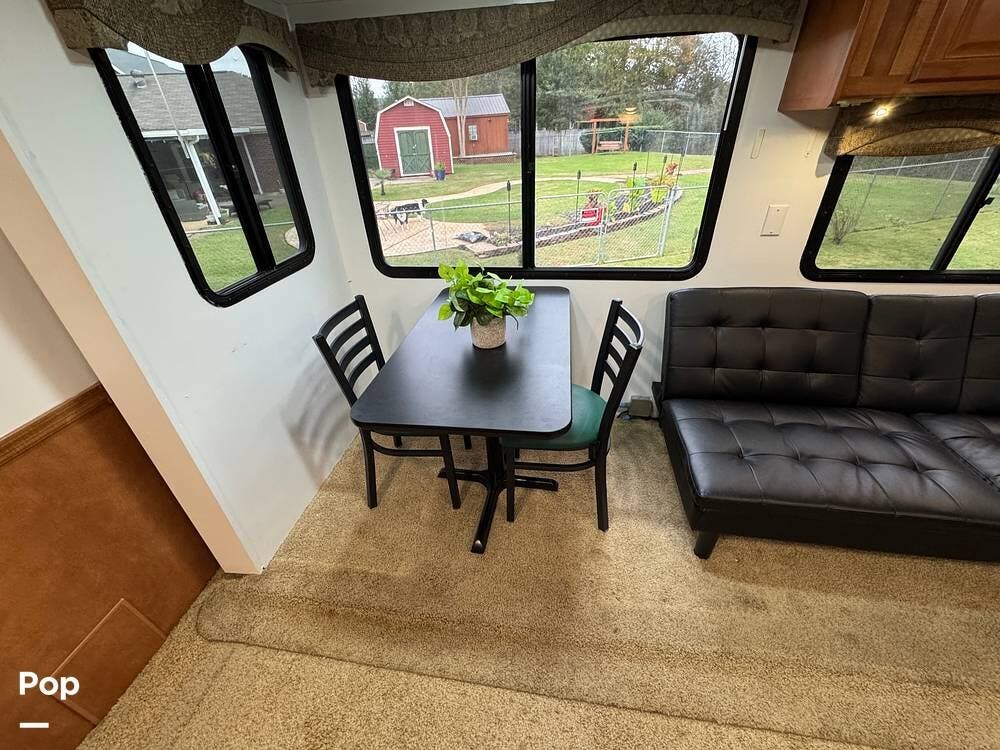 The factory sofa and booth dinette were replaced with new residential-style furniture -- a sleek black sleeper sofa and a freestanding dinette set -- creating a more spacious, home-like feel. Large panoramic windows fill the cabin with natural light, complemented by updated LED lighting and a neutral, modern decor.