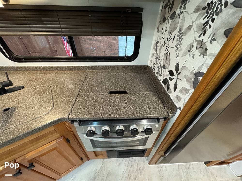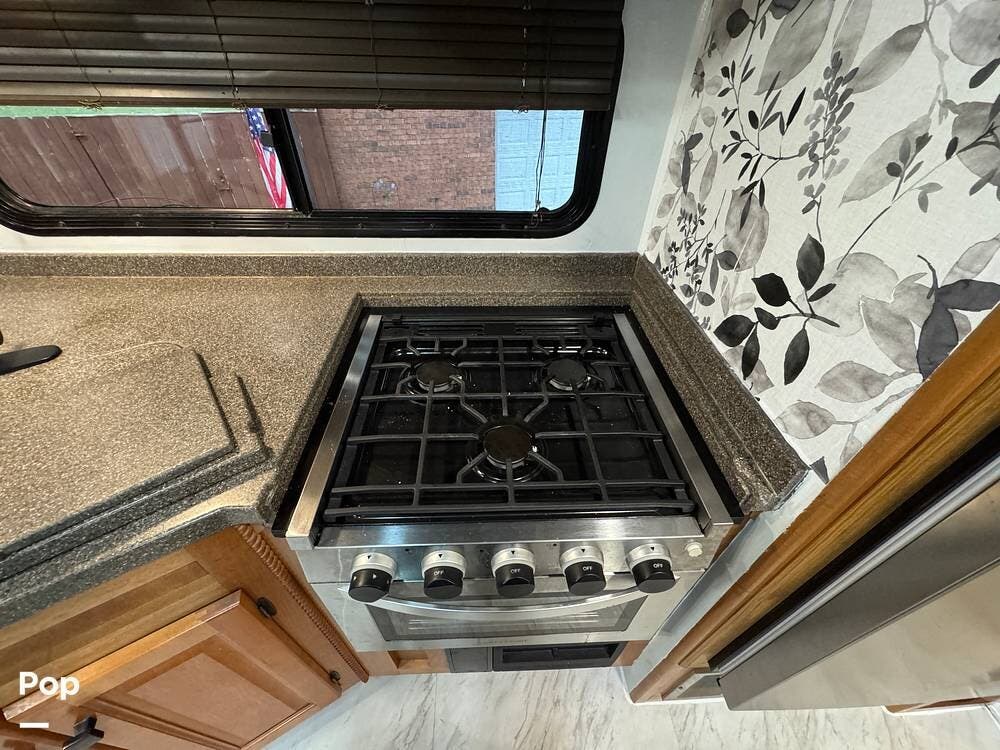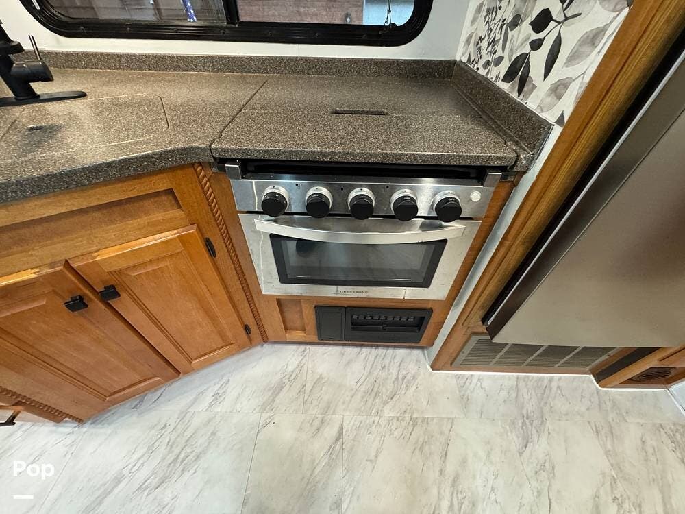 A well-equipped galley features solid-surface countertops, a 3-burner range with oven, microwave, double-door refrigerator, and plenty of cabinet storage. The refreshed backsplash adds a modern touch while keeping cleanup easy.