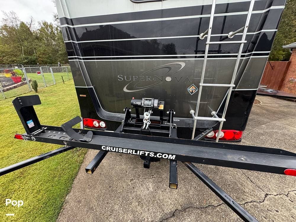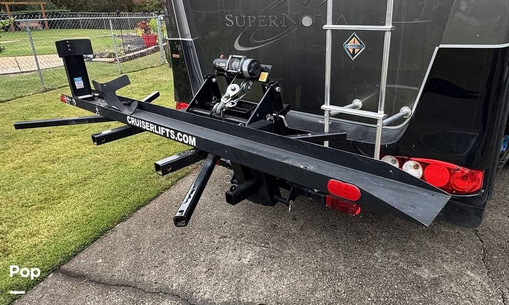 Features include a diesel generator, automatic hydraulic leveling, pass-through storage bays, aluminum wheels, and a Cruiser Lift motorcycle platform designed specifically for two-wheel vehicles such as motorcycles or scooters.